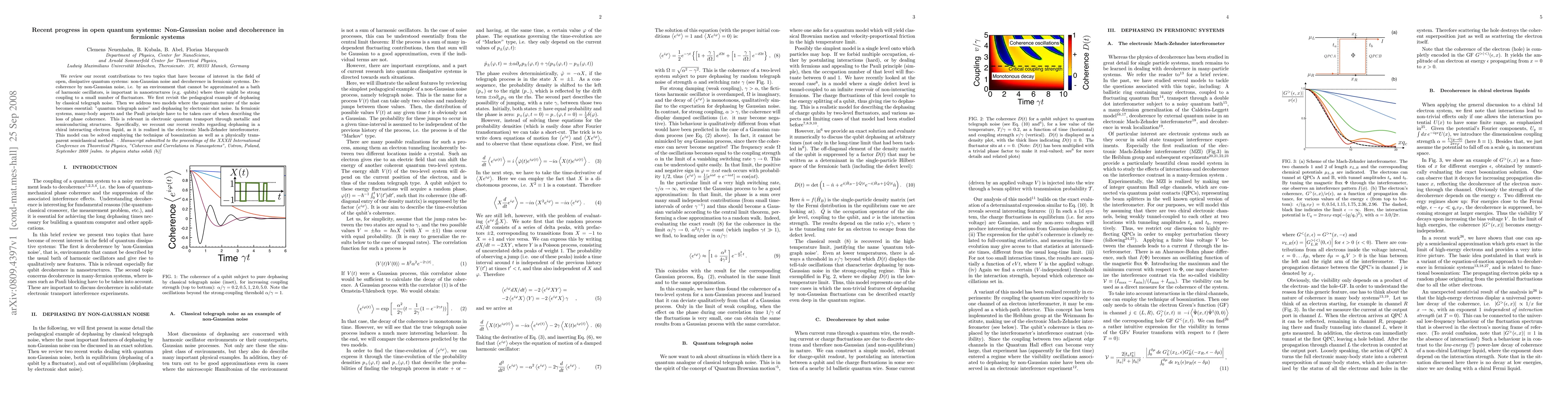 We review our recent contributions to two topics that have become of interest in the field of open, dissipative quantum systems: non-Gaussian noise and decoherence in fermionic systems. Decoherence by non-Gaussian noise, i.e. by an environment that cannot be approximated as a bath of harmonic oscillators, is important in nanostructures (e.g. qubits) where there might be strong coupling to a small number of fluctuators. We first revisit the pedagogical example of dephasing by classical telegraph noise. Then we address two models where the quantum nature of the noise becomes essential: "quantum telegraph noise" and dephasing by electronic shot noise. In fermionic systems, many-body aspects and the Pauli principle have to be taken care of when describing the loss of phase coherence. This is relevant in electronic quantum transport through metallic and semiconducting structures. Specifically, we recount our recent results regarding dephasing in a chiral interacting electron liquid, as it is realized in the electronic Mach-Zehnder interferometer. This model can be solved employing the technique of bosonization as well as a physically transparent semiclassical method.