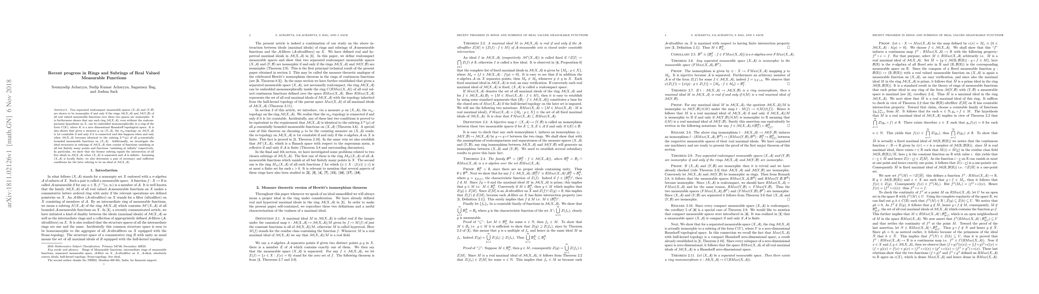 Two separated realcompact measurable spaces $(X,\mathcal{A})$ and $(Y,\mathcal{B})$ are shown to be isomorphic if and only if the rings $\mathcal{M}(X,\mathcal{A})$ and $\mathcal{M}(Y,\mathcal{B})$ of all real valued measurable functions over these two spaces are isomorphic. It is furthermore shown that any such ring $\mathcal{M}(X,\mathcal{A})$, even without the realcompactness hypothesis on $X$, can be embedded monomorphically in a ring of the form $C(K)$, where $K$ is a zero dimensional Hausdorff topological space. It is also shown that given a measure $\mu$ on $(X,\mathcal{A})$, the $m_\mu$-topology on $\mathcal{M}(X,\mathcal{A})$ is 1st countable if and only if it is connected and this happens when and only when $\mathcal{M}(X,\mathcal{A})$ becomes identical to the subring $L^\infty(\mu)$ of all $\mu$-essentially bounded measurable functions on $(X,\mathcal{A})$. Additionally, we investigate the ideal structures in subrings of $\mathcal{M}(X,\mathcal{A})$ that consist of functions vanishing at all but finitely many points and functions 'vanishing at infinity' respectively. In particular, we show that the former subring equals the intersection of all free ideals in $\mathcal{M}(X,\mathcal{A})$ when $(X,\mathcal{A})$ is separated and $\mathcal{A}$ is infinite. Assuming $(X,\mathcal{A})$ is locally finite, we also determine a pair of necessary and sufficient conditions for the later subring to be an ideal of $\mathcal{M}(X,\mathcal{A})$.