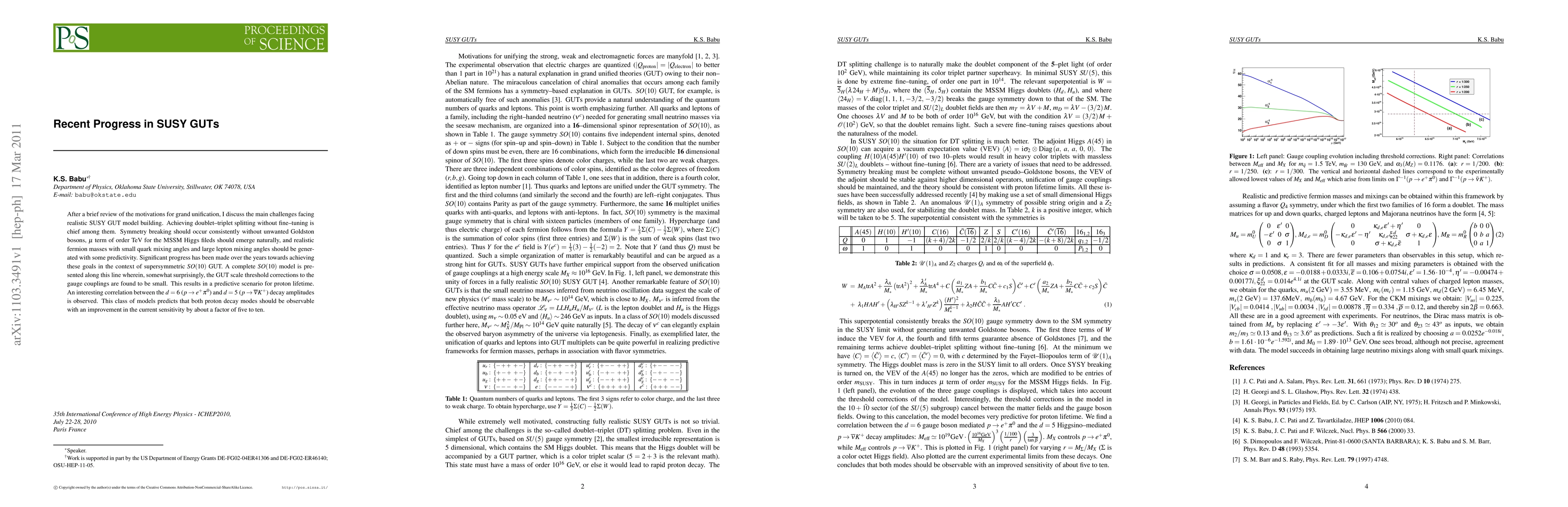 After a brief review of the motivations for grand unification, I discuss the main challenges facing realistic SUSY GUT model building. Achieving doublet-triplet splitting without fine--tuning is chief among them. Symmetry breaking should occur consistently without unwanted Goldston bosons, \mu-term of order TeV for the MSSM Higgs fileds should emerge naturally, and realistic fermion masses with small quark mixing angles and large lepton mixing angles should be generated with some predictivity. Significant progress has been made over the years towards achieving these goals in the context of supersymmetric SO(10) GUT. A complete SO(10) model is presented along this line wherein, somewhat surprisingly, the GUT scale threshold corrections to the gauge couplings are found to be small. This results in a predictive scenario for proton lifetime. An interesting correlation between the d=6 (p\to e^+\pi^0) and d=5 (p\to \nu-bar K^+) decay amplitudes is observed. This class of models predicts that both proton decay modes should be observable with an improvement in the current sensitivity by about a factor of five to ten.