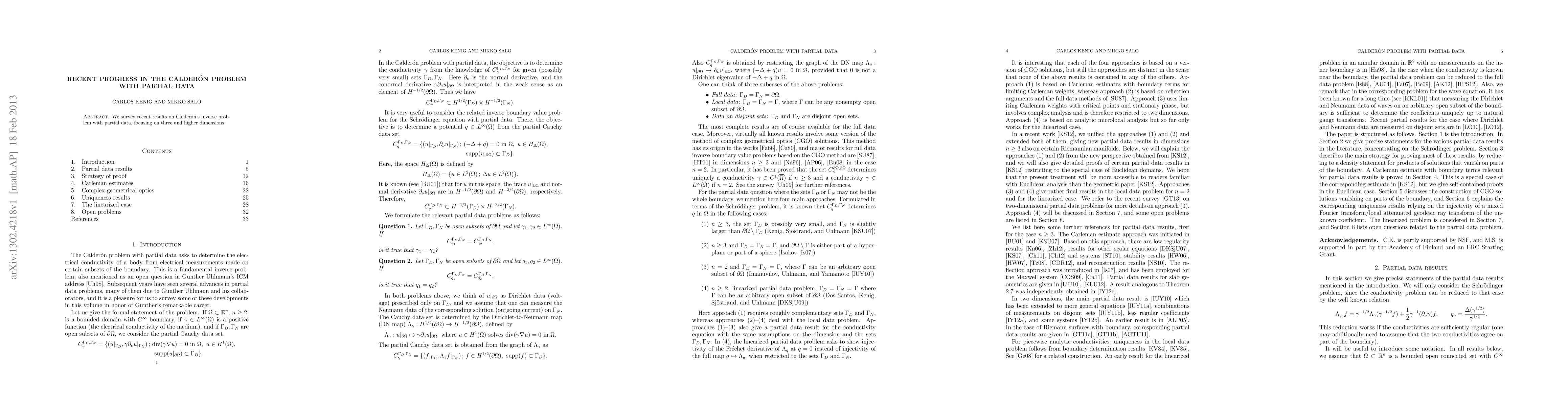 Summary: This paper reviews recent advancements in solving Calderon's inverse problem using partial data, emphasizing methodologies applicable in three and higher dimensional spaces. The focus is on the mathematical techniques and their effectiveness in reconstructing underlying physical properties.