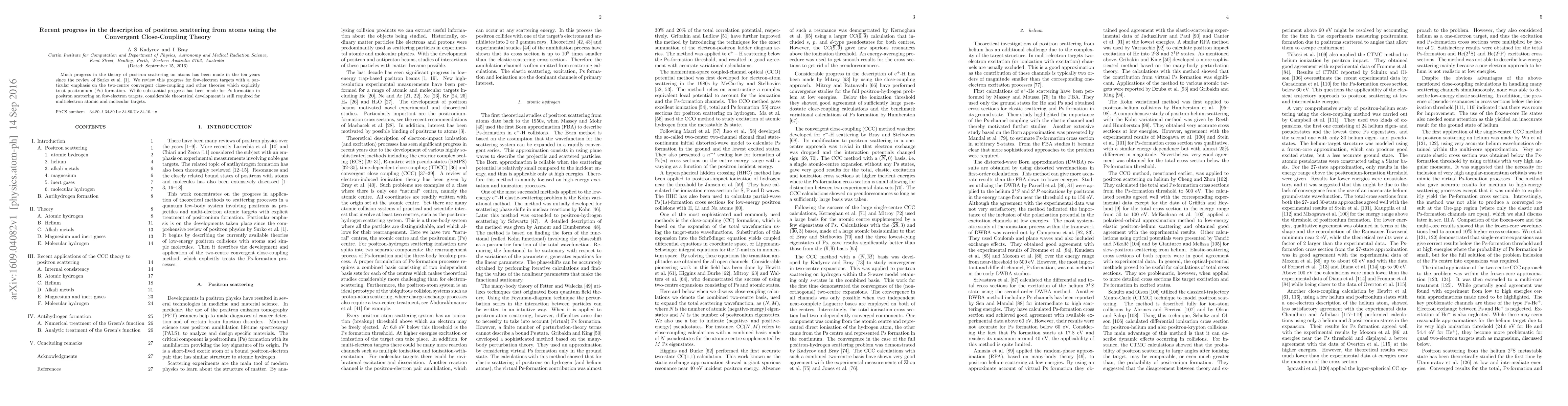 Much progress in the theory of positron scattering on atoms has been made in the ten years since the review of Surko, Gribakin and Buckman [J. Phys. B 38, R57 (2005)]. We review this progress for few-electron targets with a particular emphasis on the two-centre convergent close-coupling and other theories which explicitly treat positronium (Ps) formation. While substantial progress has been made for Ps formation in positron scattering on few-electron targets, considerable theoretical development is still required for multielectron atomic and molecular targets.