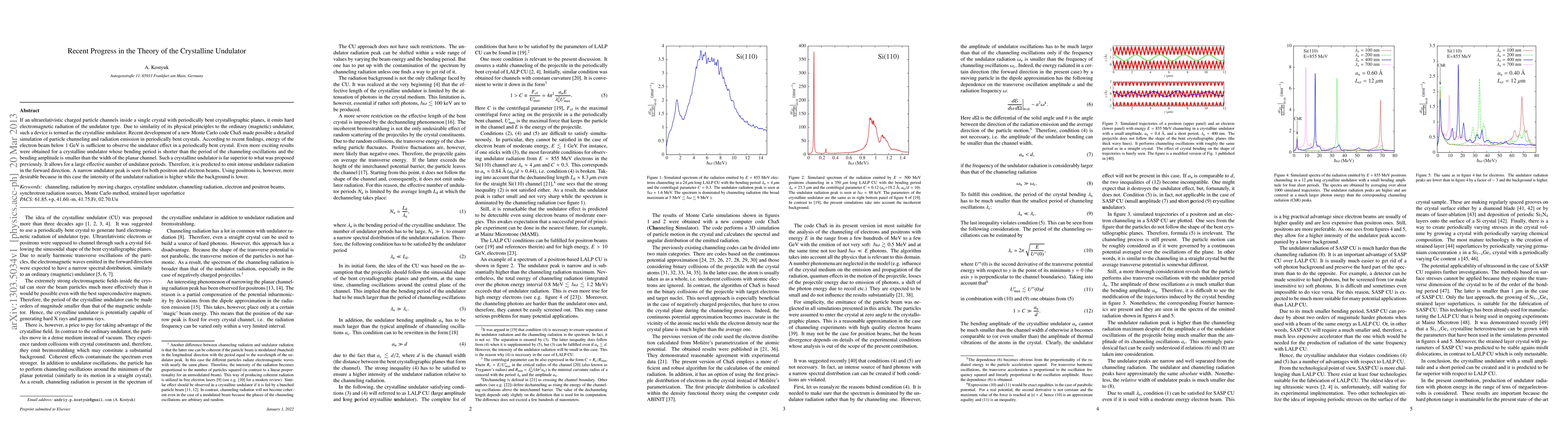 If an ultrarelativistic charged particle channels inside a single crystal with periodically bent crystallographic planes, it emits hard electromagnetic radiation of the undulator type. Due to similarity of its physical principles to the ordinary (magnetic) undulator, such a device is termed as the crystalline undulator. Recent development of a new Monte Carlo code ChaS made possible a detailed simulation of particle channeling and radiation emission in periodically bent crystals. According to recent findings, energy of the electron beam below 1 GeV is sufficient to observe the undulator effect in a periodically bent crystal. Even more exciting results were obtained for a crystalline undulator whose bending period is shorter than the period of the channeling oscillations and the bending amplitude is smaller than the width of the planar channel. Such a crystalline undulator is far superior to what was proposed previously. It allows for a large effective number of undulator periods. Therefore, it is predicted to emit intense undulator radiation in the forward direction. A narrow undulator peak is seen for both positron and electron beams. Using positrons is, however, more desirable because in this case the intensity of the undulator radiation is higher while the background is lower.