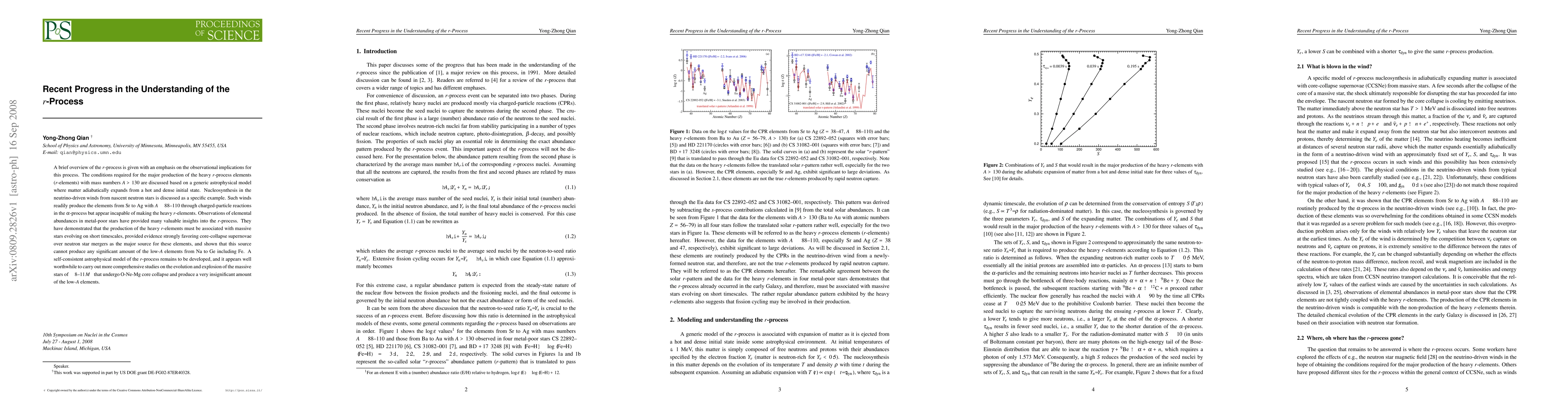 A brief overview of the r-process is given with an emphasis on the observational implications for this process. The conditions required for the major production of the heavy r-process elements (r-elements) with mass numbers A >130 are discussed based on a generic astrophysical model where matter adiabatically expands from a hot and dense initial state. Nucleosynthesis in the neutrino-driven winds from nascent neutron stars is discussed as a specific example. Such winds readily produce the elements from Sr to Ag with A ~ 88 to 110 through charged-particle reactions in the alpha-process but appear incapable of making the heavy r-elements. Observations of elemental abundances in metal-poor stars have provided many valuable insights into the r-process. They have demonstrated that the production of the heavy r-elements must be associated with massive stars evolving on short timescales, provided evidence strongly favoring core-collapse supernovae over neutron star mergers as the major source for these elements, and shown that this source cannot produce any significant amount of the low-A elements from Na to Ge including Fe. A self-consistent astrophysical model of the r-process remains to be developed, and it appears well worthwhile to carry out more comprehensive studies on the evolution and explosion of the massive stars of ~ 8 to 11 M_sun that undergo O-Ne-Mg core collapse and produce a very insignificant amount of the low-A elements.