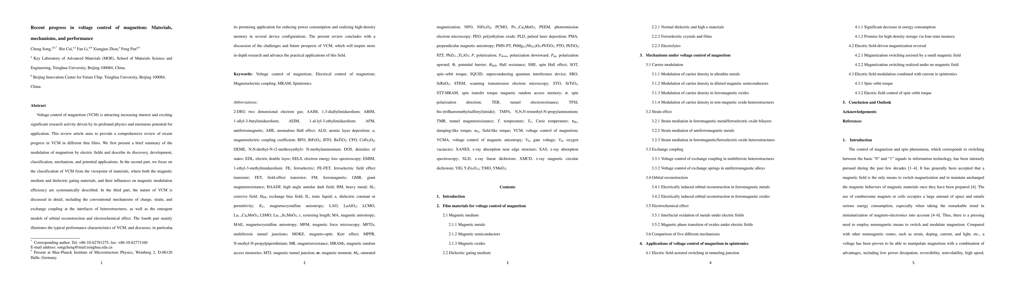 Voltage control of magnetism (VCM) is attracting increasing interest and exciting significant research activity driven by its profound physics and enormous potential for application. This review article aims to provide a comprehensive review of recent progress in VCM in different thin films. We first present a brief summary of the modulation of magnetism by electric fields and describe its discovery, development, classification, mechanism, and potential applications. In the second part, we focus on the classification of VCM from the viewpoint of materials, where both the magnetic medium and dielectric gating materials, and their influences on magnetic modulation efficiency are systematically described. In the third part, the nature of VCM is discussed in detail, including the conventional mechanisms of charge, strain, and exchange coupling at the interfaces of heterostructures, as well as the emergent models of orbital reconstruction and electrochemical effect. The fourth part mainly illustrates the typical performance characteristics of VCM, and discusses, in particular, its promising application for reducing power consumption and realizing high-density memory in several device configurations. The present review concludes with a discussion of the challenges and future prospects of VCM, which will inspire more in-depth research and advance the practical applications of this field.