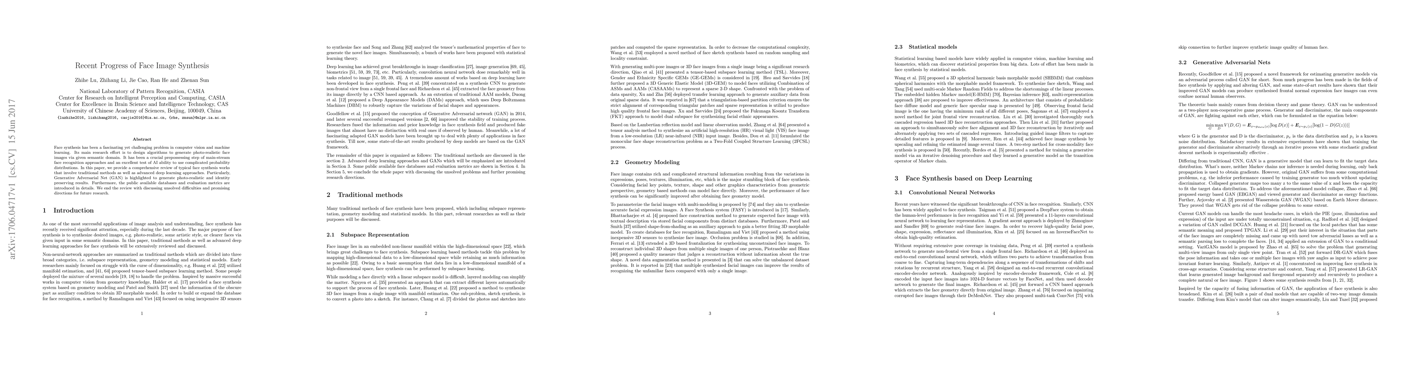 Face synthesis has been a fascinating yet challenging problem in computer vision and machine learning. Its main research effort is to design algorithms to generate photo-realistic face images via given semantic domain. It has been a crucial prepossessing step of main-stream face recognition approaches and an excellent test of AI ability to use complicated probability distributions. In this paper, we provide a comprehensive review of typical face synthesis works that involve traditional methods as well as advanced deep learning approaches. Particularly, Generative Adversarial Net (GAN) is highlighted to generate photo-realistic and identity preserving results. Furthermore, the public available databases and evaluation metrics are introduced in details. We end the review with discussing unsolved difficulties and promising directions for future research.