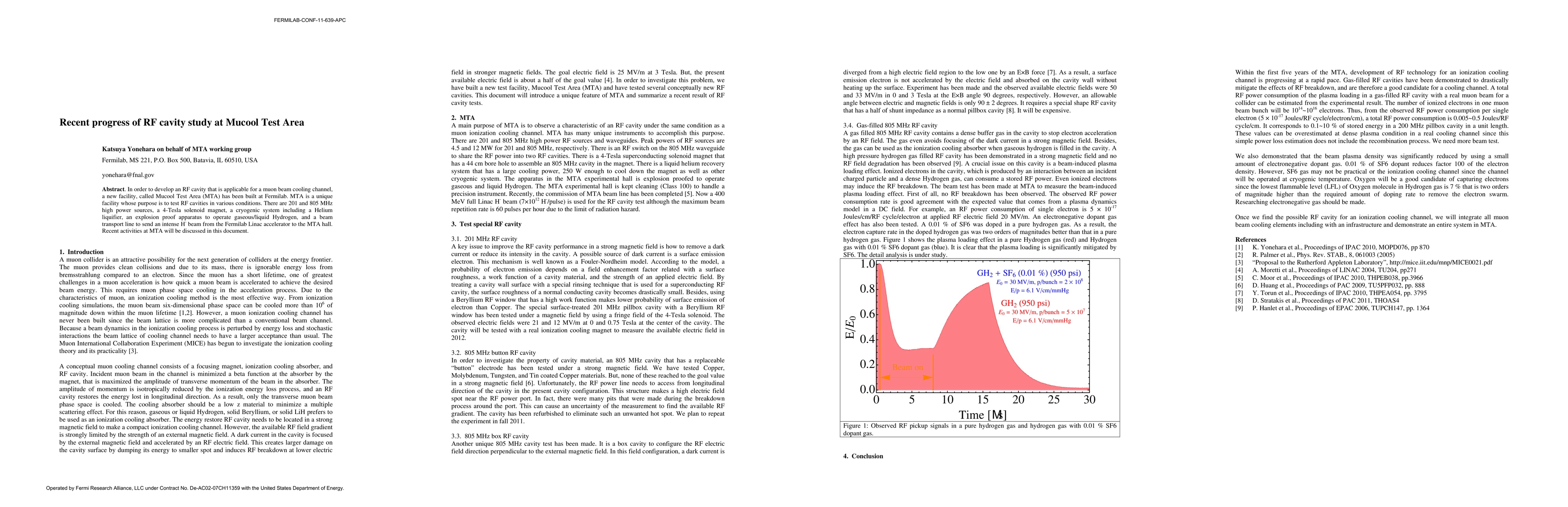 In order to develop an RF cavity that is applicable for a muon beam cooling channel, a new facility, called Mucool Test Area (MTA) has been built at Fermilab. MTA is a unique facility whose purpose is to test RF cavities in various conditions. There are 201 and 805 MHz high power sources, a 4-Tesla solenoid magnet, a cryogenic system including a Helium liquifier, an explosion proof apparatus to operate gaseous/liquid Hydrogen, and a beam transport line to send an intense H- beam from the Fermilab Linac accelerator to the MTA hall. Recent activities at MTA will be discussed in this document.