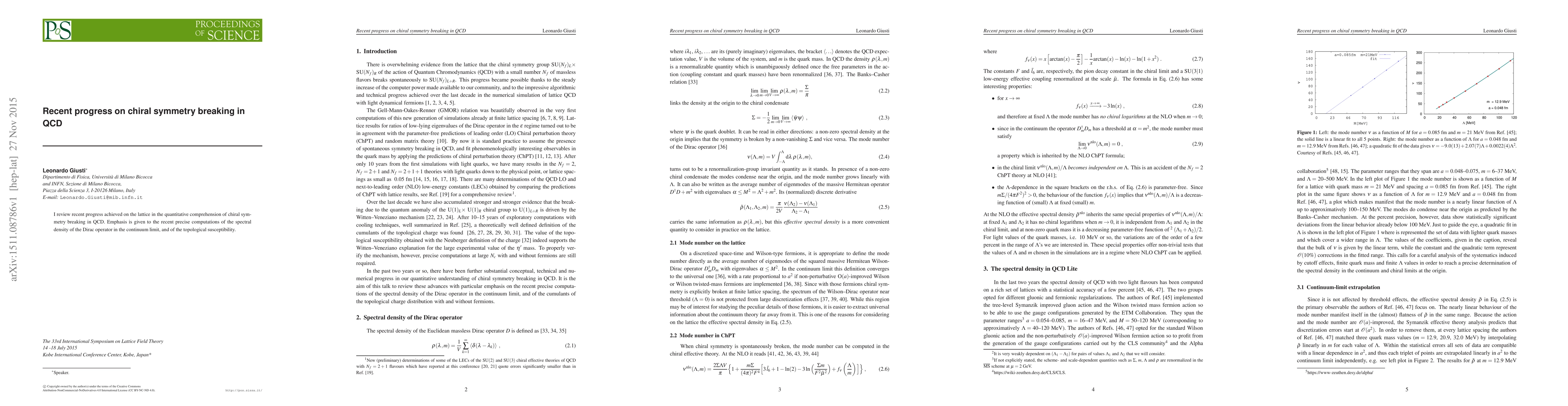 Summary: This paper reviews recent advancements in understanding chiral symmetry breaking in Quantum Chromodynamics (QCD) using lattice methods, focusing on precise computations of the Dirac operator's spectral density and topological susceptibility in the continuum limit.