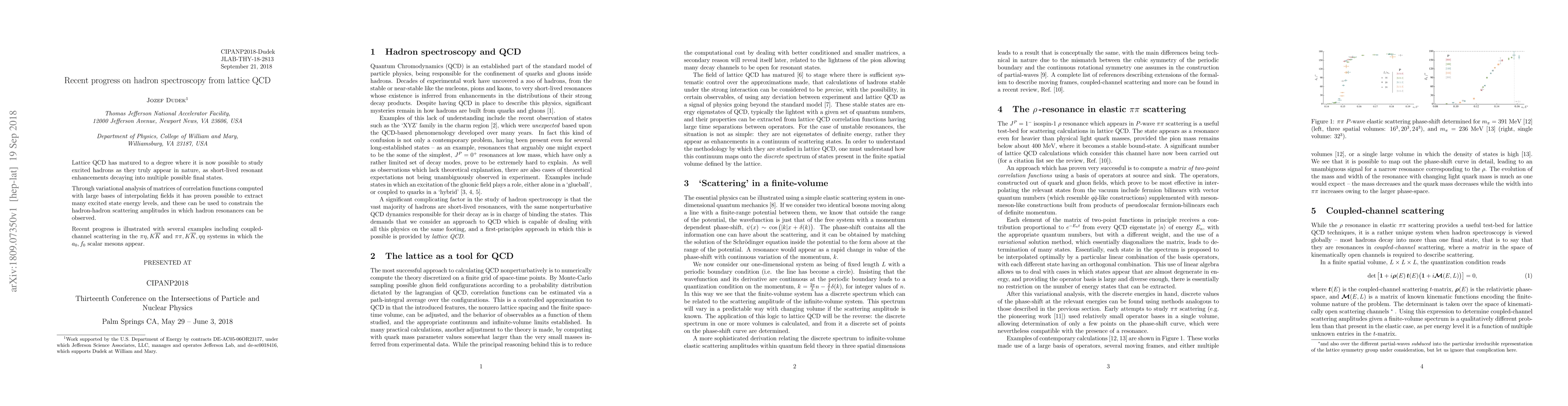 The research employs lattice QCD to study hadron spectroscopy, utilizing variational analysis of correlation matrices with large interpolating field bases to extract excited state energy levels. These levels constrain hadron-hadron scattering amplitudes, allowing for the observation of hadron resonances.