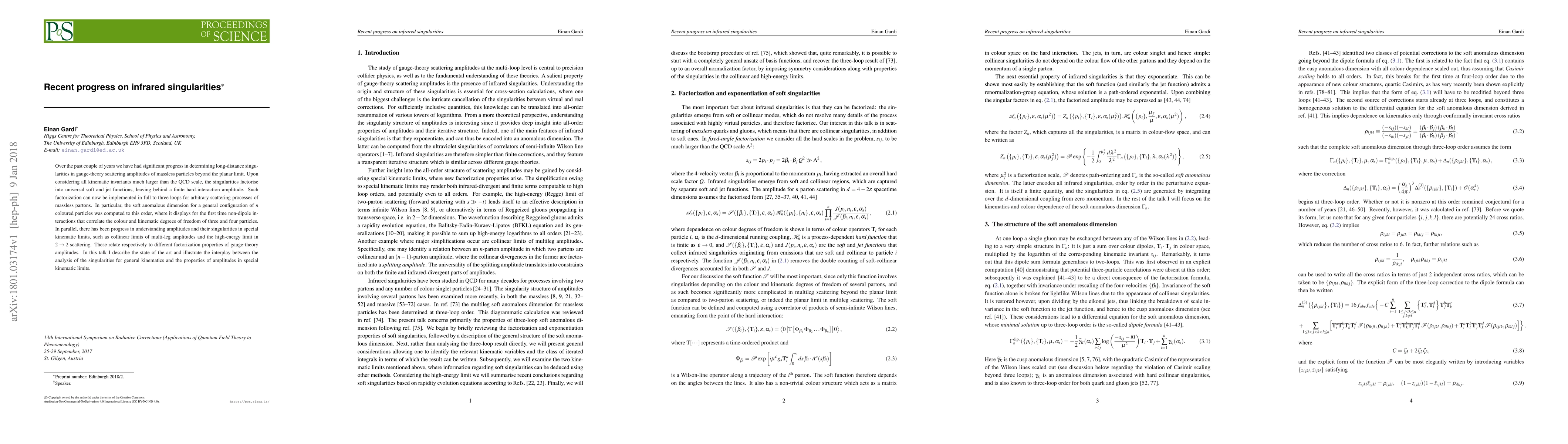 Recent research has advanced the understanding of long-distance singularities in gauge-theory scattering amplitudes for massless particles, revealing factorization into soft and jet functions. Significant progress includes the computation of the soft anomalous dimension to three loops, showcasing non-dipole interactions correlating color and kinematic degrees of freedom.