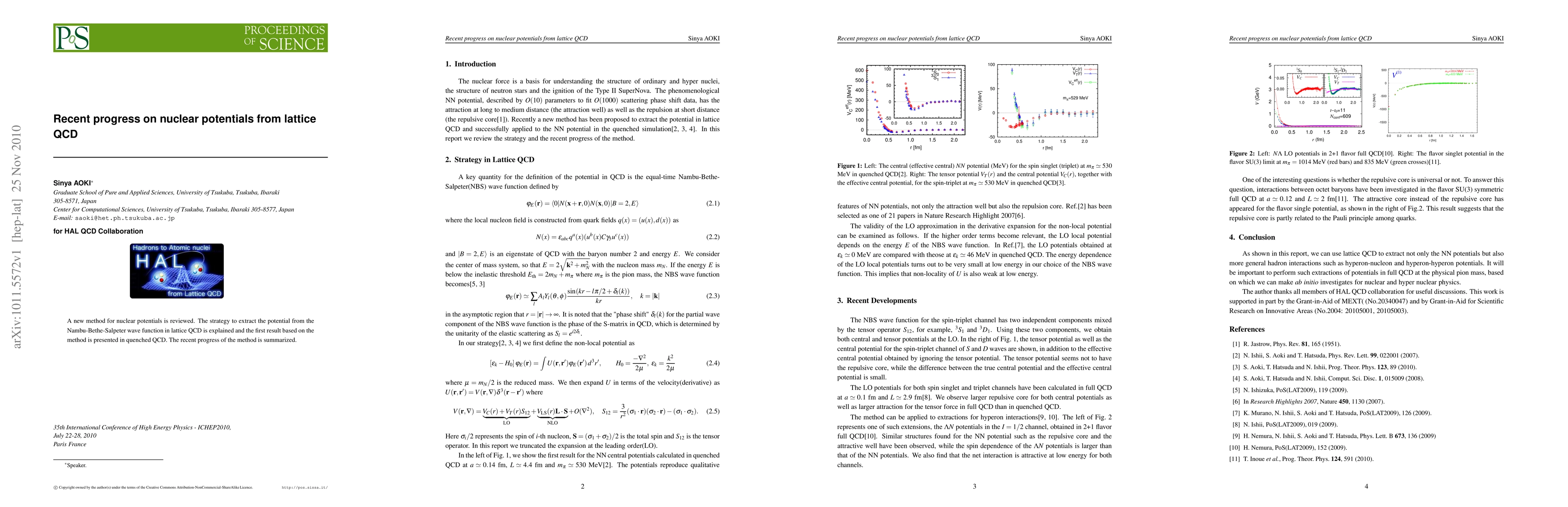 Summary: This paper reviews a novel method for extracting nuclear potentials from lattice QCD, focusing on the Nambu-Bethe-Salpeter wave function approach. Initial results from quenched QCD are presented, summarizing recent advancements in this promising technique.