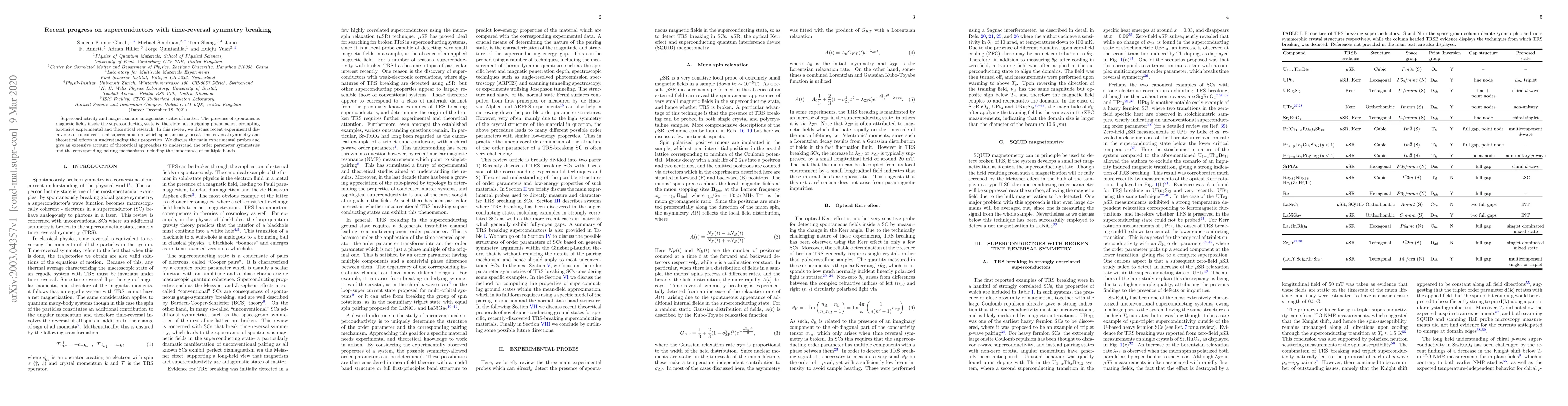 This paper reviews recent experimental findings on unconventional superconductors that break time-reversal symmetry, alongside theoretical efforts to understand their unique properties, order parameter symmetries, and pairing mechanisms, emphasizing the role of multiple electronic bands.