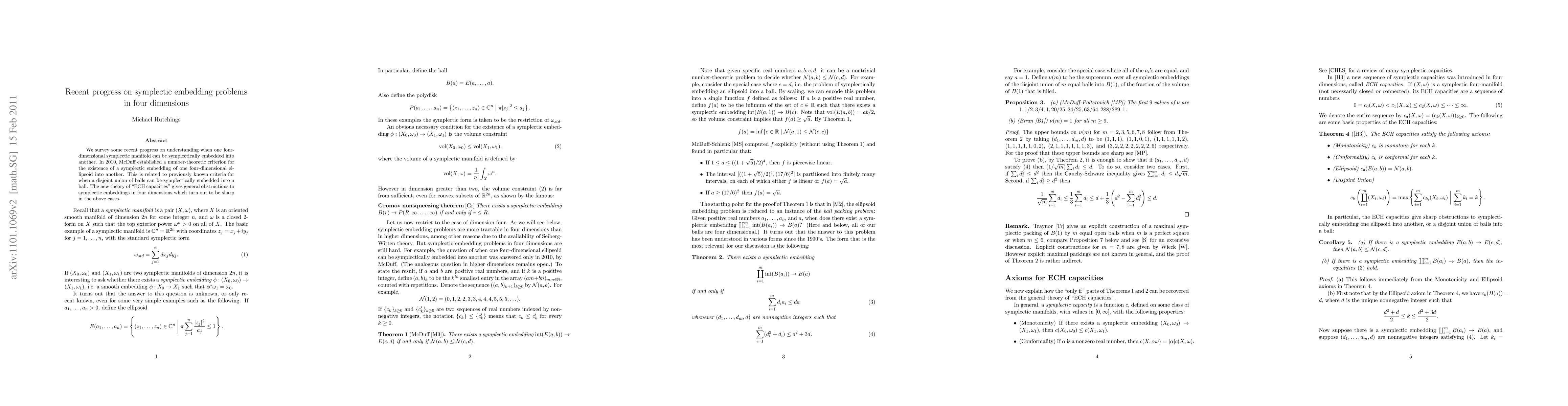 This paper surveys recent advancements in understanding symplectic embeddings of four-dimensional manifolds, focusing on McDuff's 2010 number-theoretic criterion for embedding ellipsoids and the new "ECH capacities" that provide sharp obstructions to such embeddings.