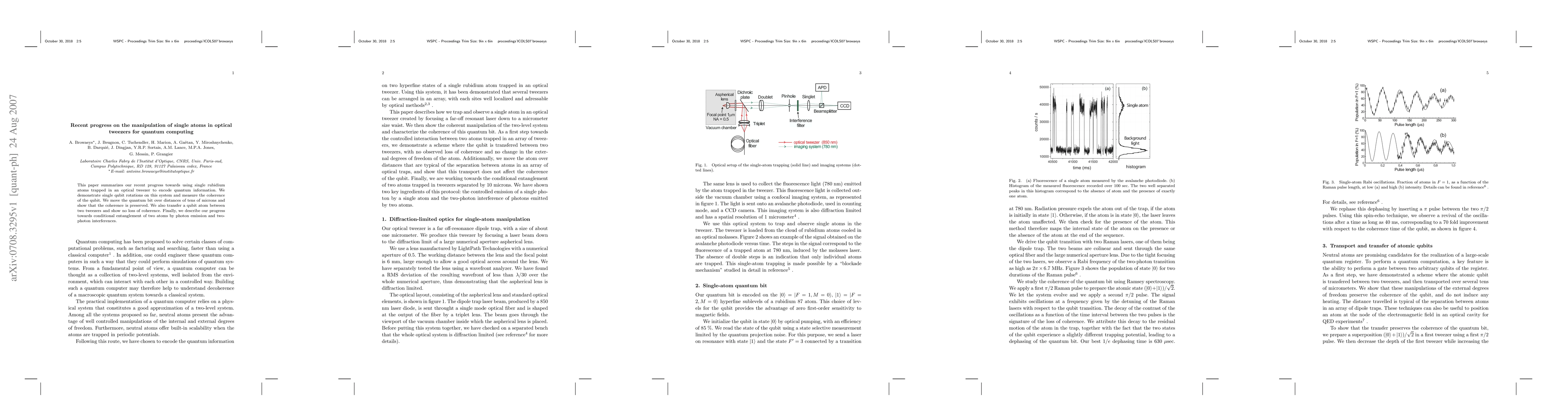 This paper reports advancements in using single rubidium atoms trapped in optical tweezers for quantum computing, demonstrating single qubit rotations, coherence preservation over micron-scale distances, and successful qubit transfer without coherence loss, along with progress towards conditional entanglement.