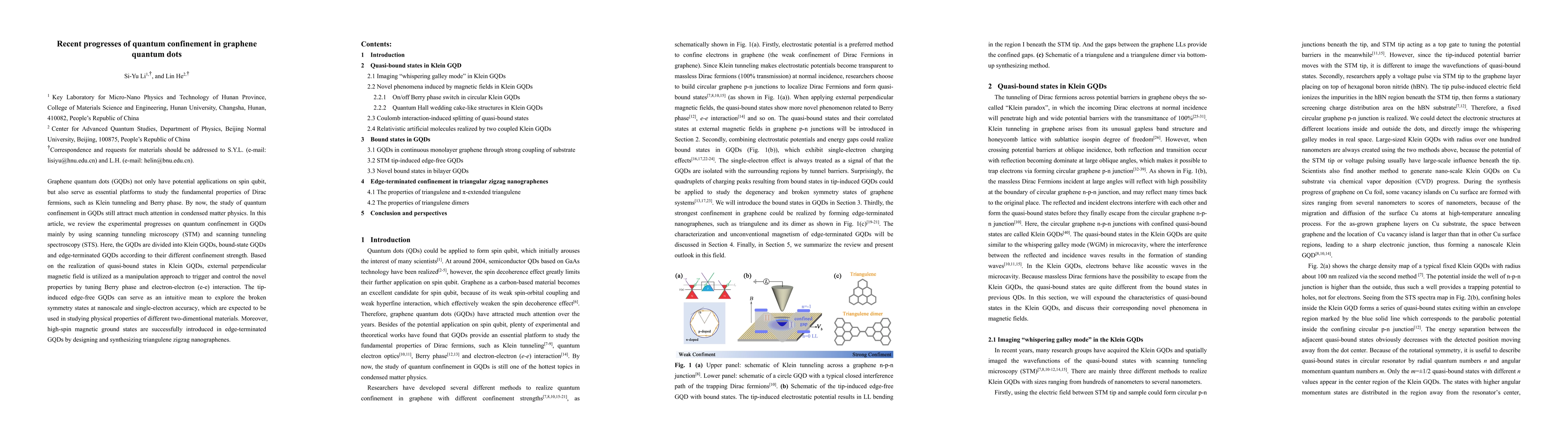 Graphene quantum dots (GQDs) not only have potential applications on spin qubit,but also serve as essential platforms to study the fundamental properties of Dirac fermions, such as Klein tunneling and Berry phase. By now, the study of quantum confinement in GQDs still attract much attention in condensed matter physics. In this article, we review the experimental progresses on quantum confinement in GQDs mainly by using scanning tunneling microscopy (STM) and scanning tunneling spectroscopy (STS). Here, the GQDs are divided into Klein GQDs, bound-state GQDs and edge-terminated GQDs according to their different confinement strength. Based on the realization of quasi-bound states in Klein GQDs, external perpendicular magnetic field is utilized as a manipulation approach to trigger and control the novel properties by tuning Berry phase and electron-electron (e-e) interaction. The tip induced edge-free GQDs can serve as an intuitive mean to explore the broken symmetry states at nanoscale and single-electron accuracy, which are expected to be used in studying physical properties of different two-dimentional materials. Moreover, high-spin magnetic ground states are successfully introduced in edge-terminated GQDs by designing and synthesizing triangulene zigzag nanographenes.