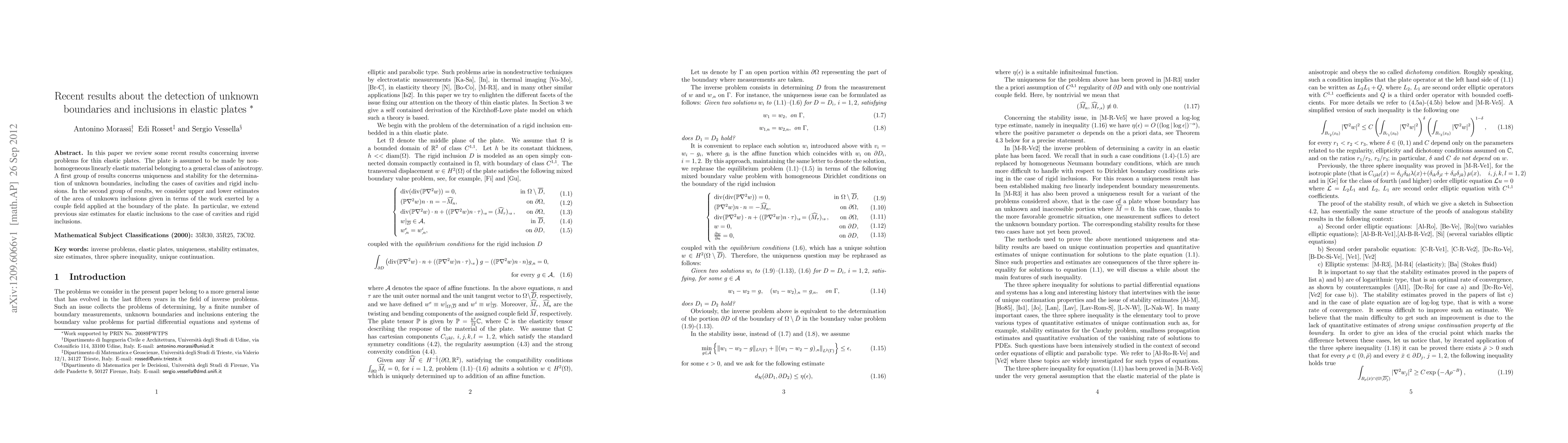 This paper reviews recent results on detecting unknown boundaries and inclusions in elastic plates, focusing on uniqueness, stability estimates, and size estimates for cavities and rigid inclusions.