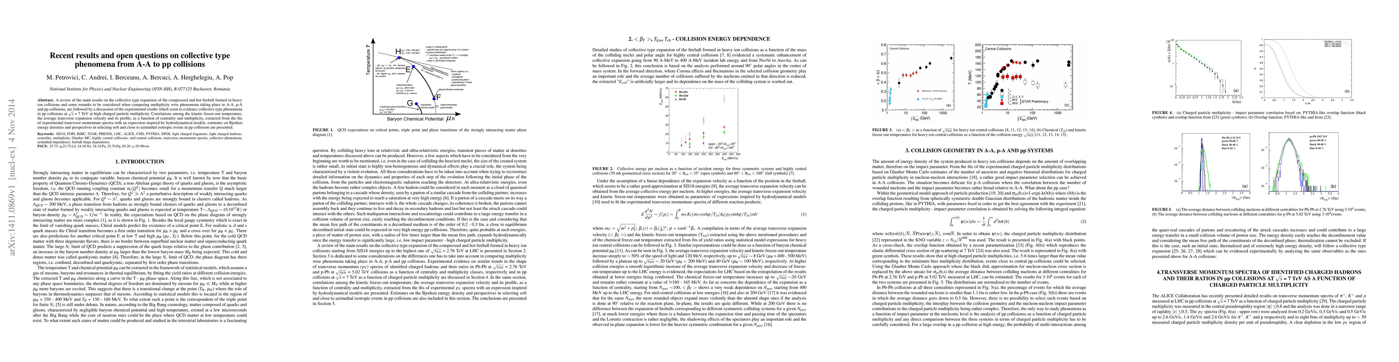 A review of the main results on the collective type expansion of the compressed and hot fireball formed in heavy ion collisions and some remarks to be considered when comparing multiplicity wise phenomena taking place in A-A, p-A and pp collisions, are followed by a discussion of the experimental results which seem to evidence collective type phenomena in pp collisions at $\sqrt{s}$ = 7 TeV at high charged particle multiplicity. Correlations among the kinetic freeze-out temperature, the average transverse expansion velocity and its profile, as a function of centrality and multiplicity, extracted from the fits of experimental transverse momentum spectra with an expression inspired by hydrodynamical models, estimates on Bjorken energy densities and perspectives in selecting soft and close to azimuthal isotropic events in pp collisions are presented.