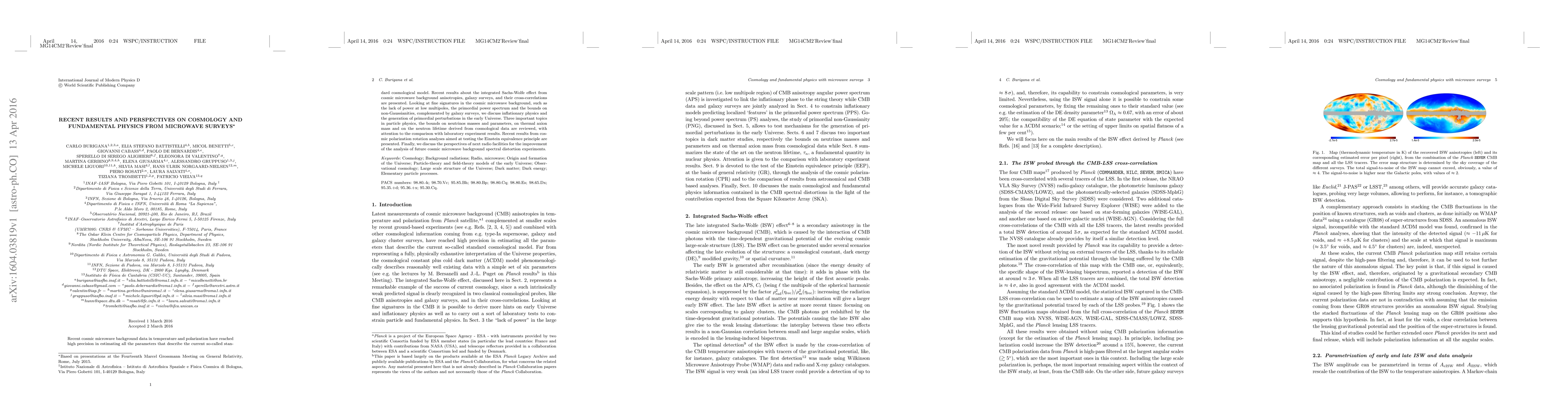 Recent cosmic microwave background data in temperature and polarization have reached high precision in estimating all the parameters that describe the current so-called standard cosmological model. Recent results about the integrated Sachs-Wolfe effect from cosmic microwave background anisotropies, galaxy surveys, and their cross-correlations are presented. Looking at fine signatures in the cosmic microwave background, such as the lack of power at low multipoles, the primordial power spectrum and the bounds on non-Gaussianities, complemented by galaxy surveys, we discuss inflationary physics and the generation of primordial perturbations in the early Universe. Three important topics in particle physics, the bounds on neutrinos masses and parameters, on thermal axion mass and on the neutron lifetime derived from cosmological data are reviewed, with attention to the comparison with laboratory experiment results. Recent results from cosmic polarization rotation analyses aimed at testing the Einstein equivalence principle are presented. Finally, we discuss the perspectives of next radio facilities for the improvement of the analysis of future cosmic microwave background spectral distortion experiments.
