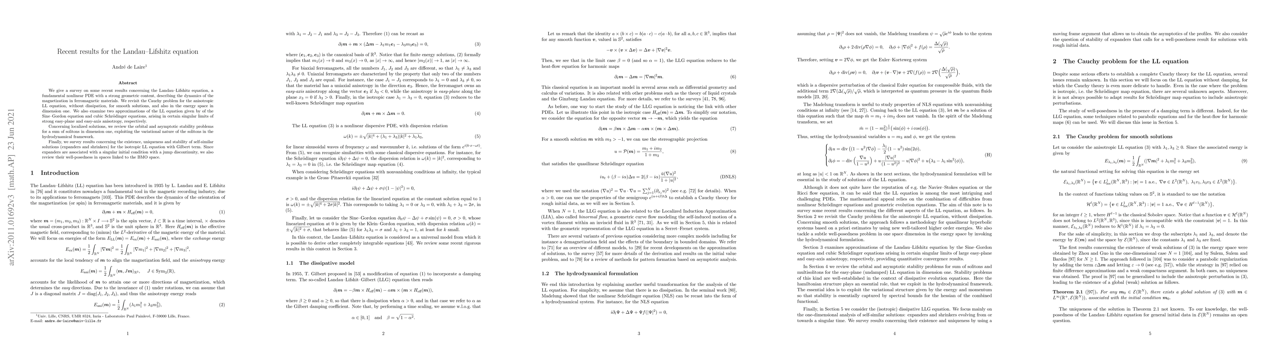 This paper surveys recent findings on the Landau-Lifshitz equation, focusing on the Cauchy problem, approximations via the Sine-Gordon and cubic Schrödinger equations, and the stability of solitons and self-similar solutions, including their well-posedness in BMO-linked spaces.