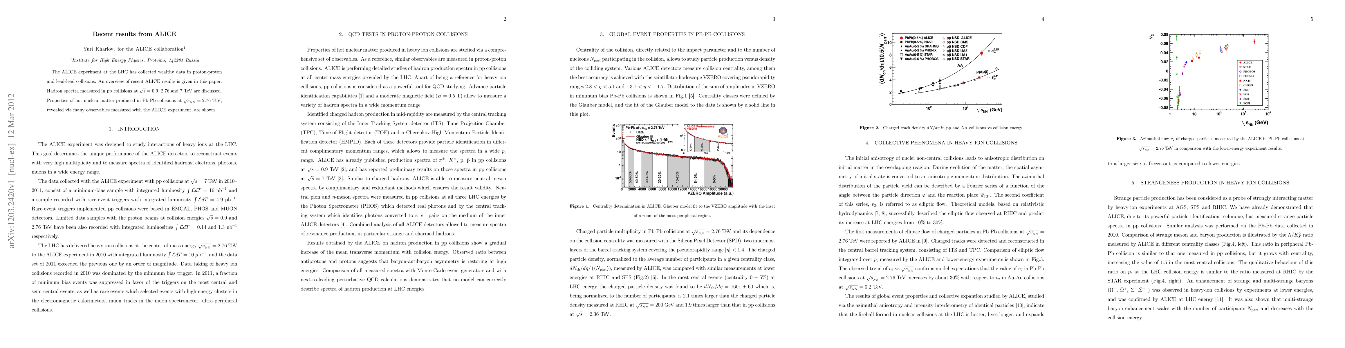 The ALICE experiment at the LHC has provided significant data on proton-proton and lead-lead collisions, detailing hadron spectra across various energies and revealing properties of hot nuclear matter in Pb-Pb collisions at 2.76 TeV.