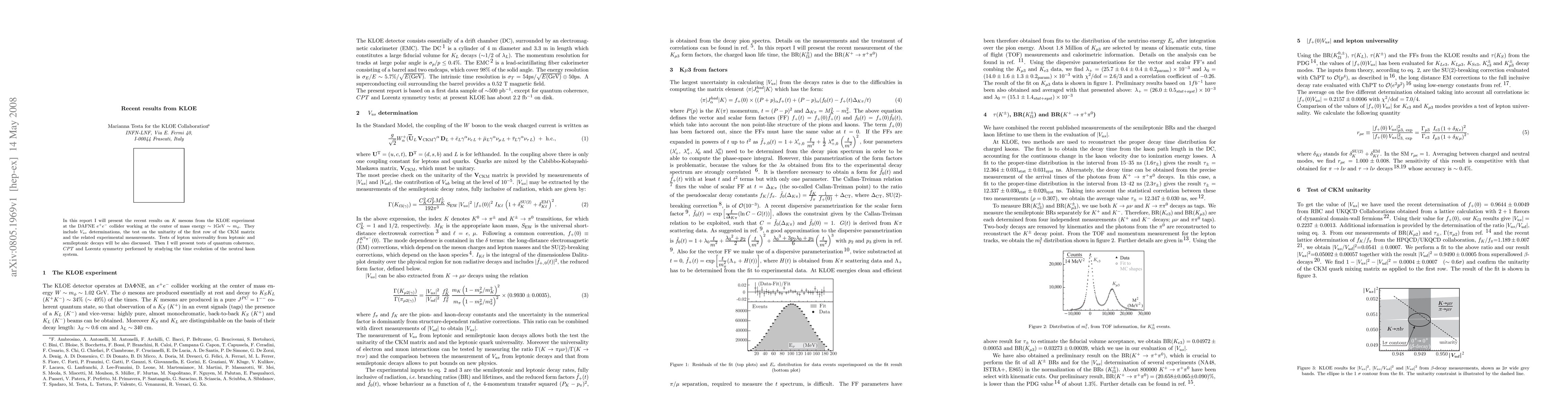 This report presents recent findings from the KLOE experiment at the DAFNE collider, focusing on the determination of V_{us}, tests of the CKM matrix unitarity, and lepton universality. It also discusses quantum coherence, CPT, and Lorentz symmetry tests via neutral kaon time evolution.