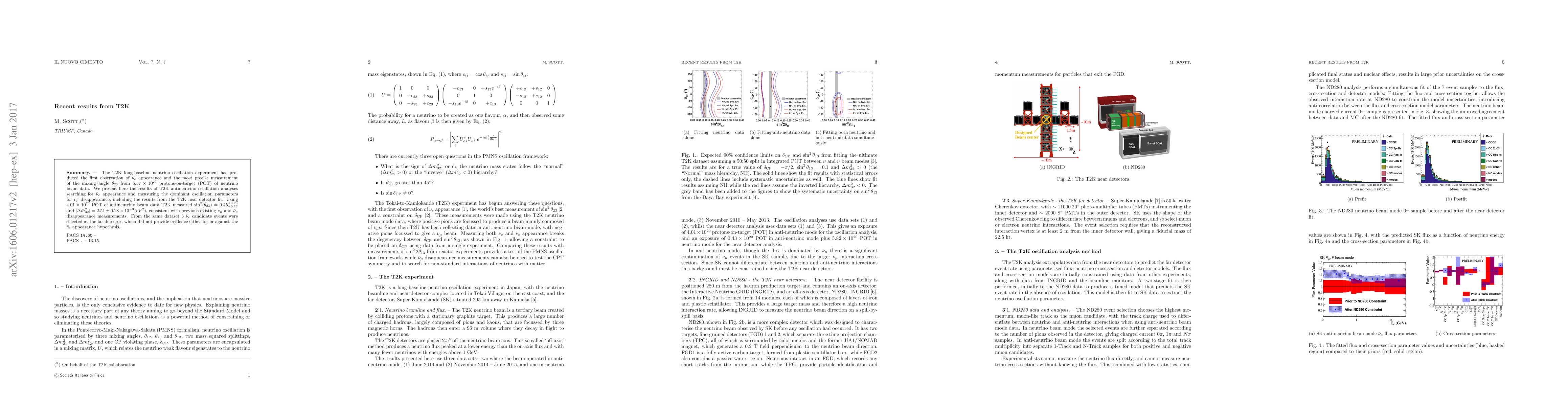 The T2K experiment has observed the first $\nu_{e}$ appearance and provided the most precise measurement of the mixing angle $\theta_{23}$. In antineutrino oscillation analyses, T2K found no evidence for $\bar{\nu}_{e}$ appearance but measured $\sin^{2}(\bar{\theta}_{23})$ and $|\Delta \bar{m}^{2}_{32}|$ consistent with previous $\nu_{\mu}$ and $\bar{\nu}_{\mu}$ disappearance measurements.