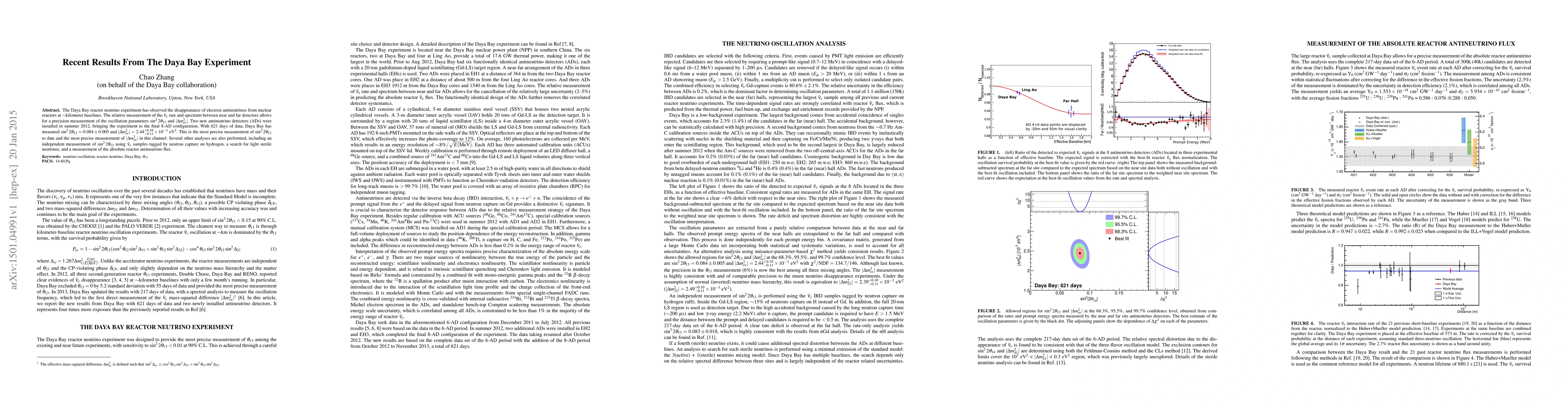 The Daya Bay reactor neutrino experiment has observed the disappearance of electron antineutrinos from nuclear reactors at $\sim$kilometer baselines. The relative measurement of the $\bar\nu_e$ rate and spectrum between near and far detectors allows for a precision measurement of the oscillation parameters $\sin^22\theta_{13}$ and $|\Delta{m}^2_{ee}|$. Two new antineutrino detectors (ADs) were installed in summer 2012, bringing the experiment to the final 8-AD configuration. With 621 days of data, Daya Bay has measured $\sin^22\theta_{13} = 0.084 \pm 0.005$ and $|\Delta{m}^2_{ee}| = 2.44^{+0.10}_{-0.11} \times 10^{-3}$ eV$^2$. This is the most precise measurement of $\sin^22\theta_{13}$ to date and the most precise measurement of $|\Delta{m}^2_{ee}|$ in this channel. Several other analyses are also performed, including an independent measurement of $\sin^22\theta_{13}$ using $\bar\nu_e$ samples tagged by neutron capture on hydrogen, a search for light sterile neutrinos, and a measurement of the absolute reactor antineutrino flux.