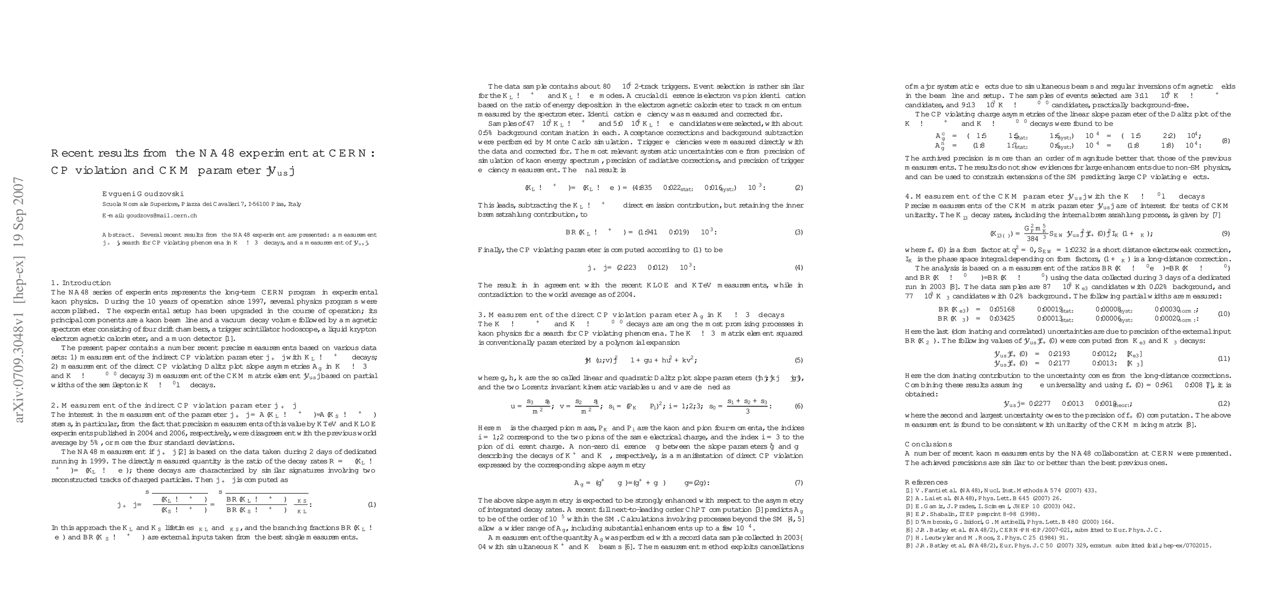 Several recent results from the NA48 experiment are presented: a measurement $|\eta_{+-}|$, search for CP violating phenomena in $K^\pm\to3\pi$ decays, and a measurement of $|V_{us}|$.