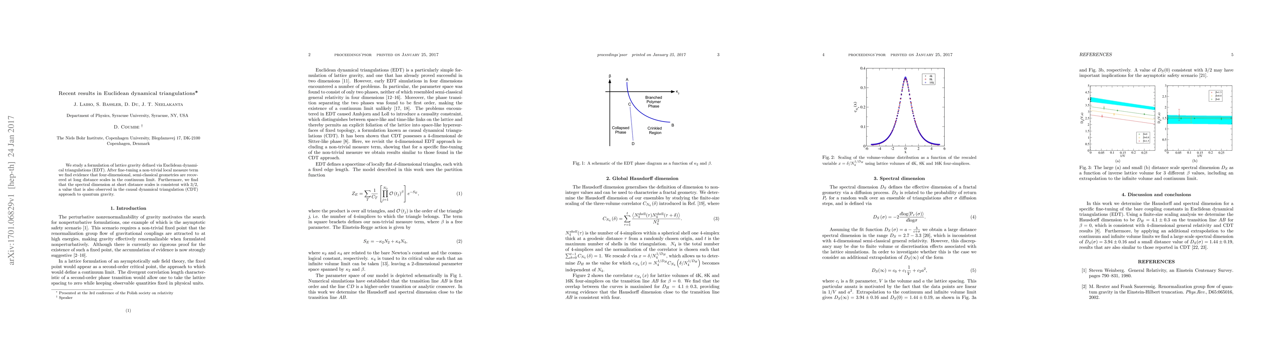 This paper investigates lattice gravity through Euclidean dynamical triangulations (EDT) and finds that it can recover four-dimensional, semi-classical geometries in the continuum limit. Additionally, the study reports a spectral dimension of 3/2 at short distances, aligning with results from the causal dynamical triangulation (CDT) approach to quantum gravity.