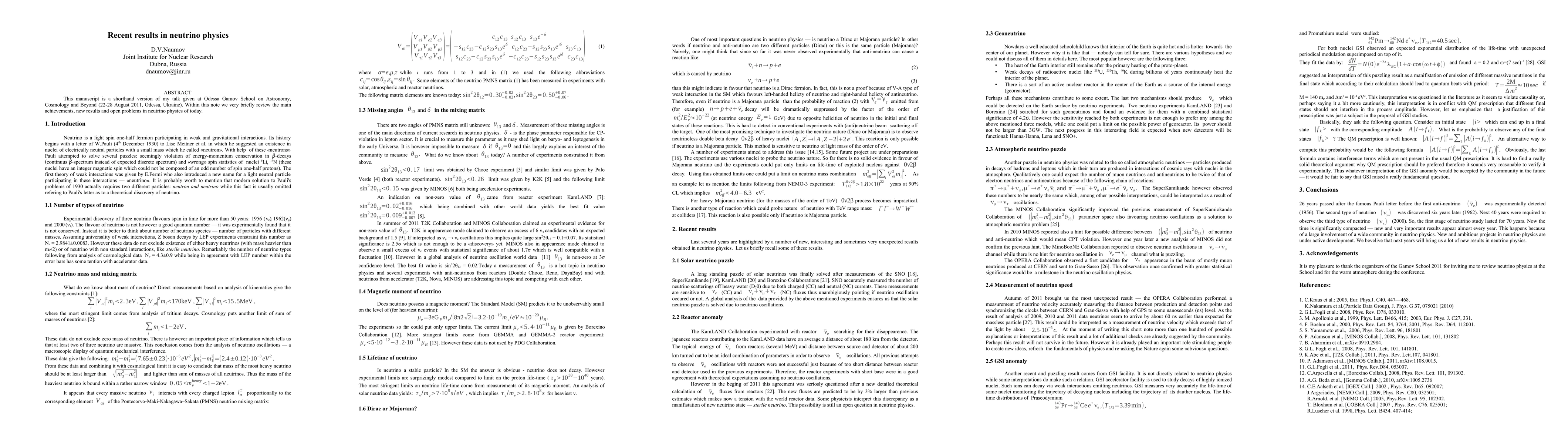 This manuscript is a shorthand version of my talk given at Odessa Gamov School on Astronomy, Cosmology and Beyond (22-28 August 2011, Odessa, Ukraine). Within this note we very briefly review the main achievements, new results and open problems in neutrino physics of today.