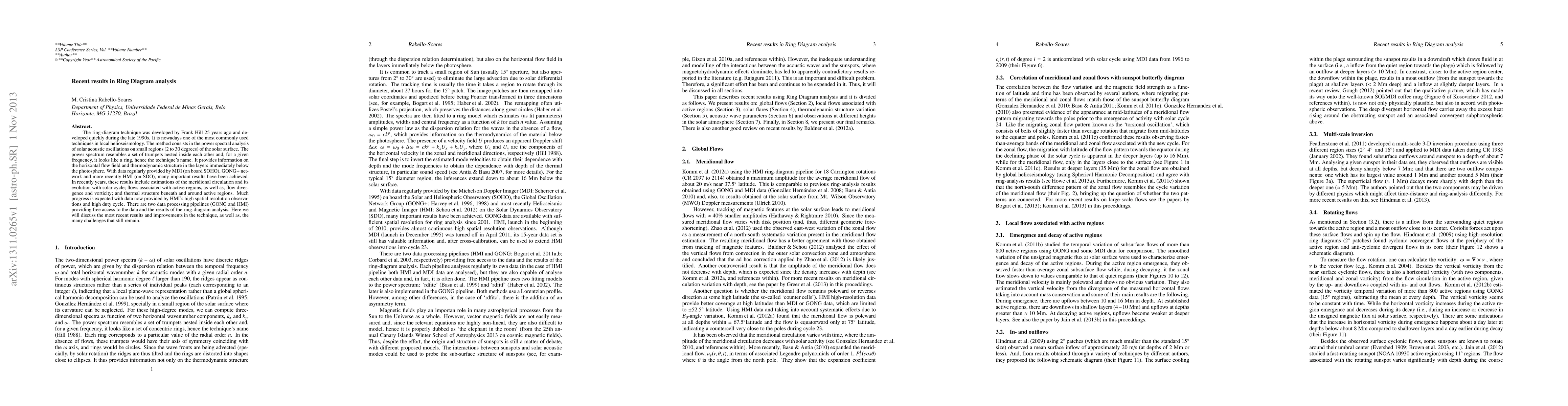 The ring-diagram technique was developed by Frank Hill 25 years ago and developed quickly during the late 1990s. It is nowadays one of the most commonly used techniques in local helioseismology. The method consists in the power spectral analysis of solar acoustic oscillations on small regions (2 to 30 degrees) of the solar surface. The power spectrum resembles a set of trumpets nested inside each other and, for a given frequency, it looks like a ring, hence the technique's name. It provides information on the horizontal flow field and thermodynamic structure in the layers immediately below the photosphere. With data regularly provided by MDI (on board SOHO), GONG+ network and more recently HMI (on SDO), many important results have been achieved. In recently years, these results include estimations of the meridional circulation and its evolution with solar cycle; flows associated with active regions, as well as, flow divergence and vorticity; and thermal structure beneath and around active regions. Much progress is expected with data now provided by HMI's high spatial resolution observations and high duty cycle. There are two data processing pipelines (GONG and HMI) providing free access to the data and the results of the ring-diagram analysis. Here we will discuss the most recent results and improvements in the technique, as well as, the many challenges that still remain.