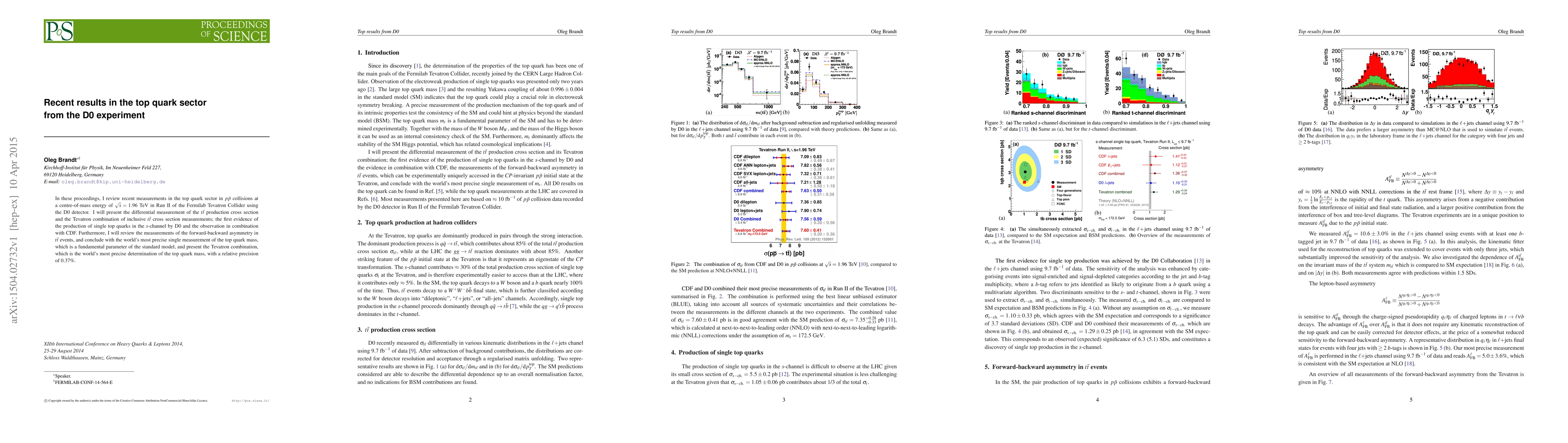 In these proceedings, I review recent measurements in the top quark sector in $p\bar p$ collisions at a centre-of-mass energy of $\sqrt s=1.96$ TeV in Run II of the Fermilab Tevatron Collider using the D0 detector. I will present the differential measurement of the $t\bar t$ production cross section and the Tevatron combination of inclusive $t\bar t$ cross section measurements; the first evidence of the production of single top quarks in the $s$-channel by D0 and the observation in combination with CDF. Furthermore, I will review the measurements of the forward-backward asymmetry in $t\bar t$ events, and conclude with the world's most precise single measurement of the top quark mass, which is a fundamental parameter of the standard model, and present the Tevatron combination, which is the world's most precise determination of the top quark mass, with a relative precision of 0.37\%.