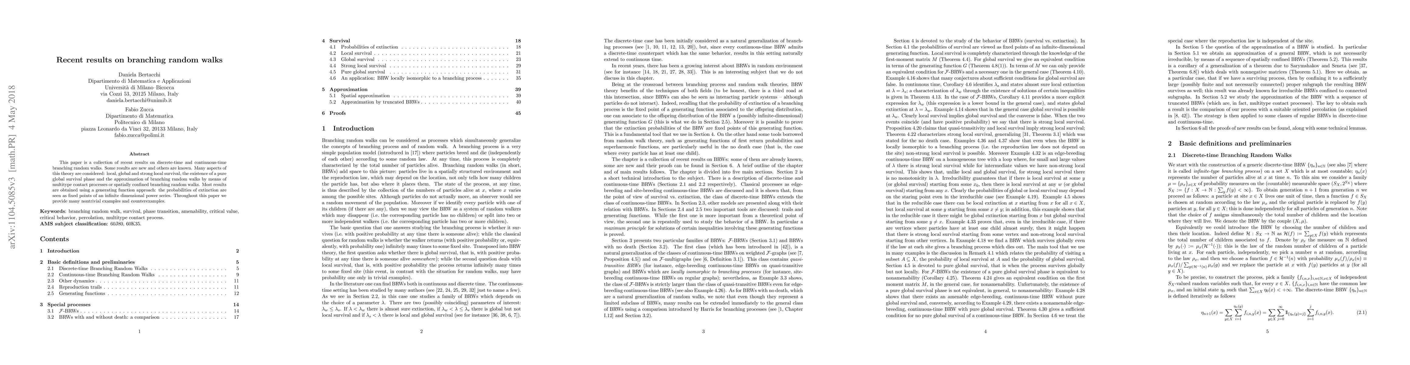 This paper compiles recent findings on branching random walks, exploring local, global, and strong local survival, and comparing them to multitype contact processes. Results are derived using generating functions and include numerous examples and counterexamples.
