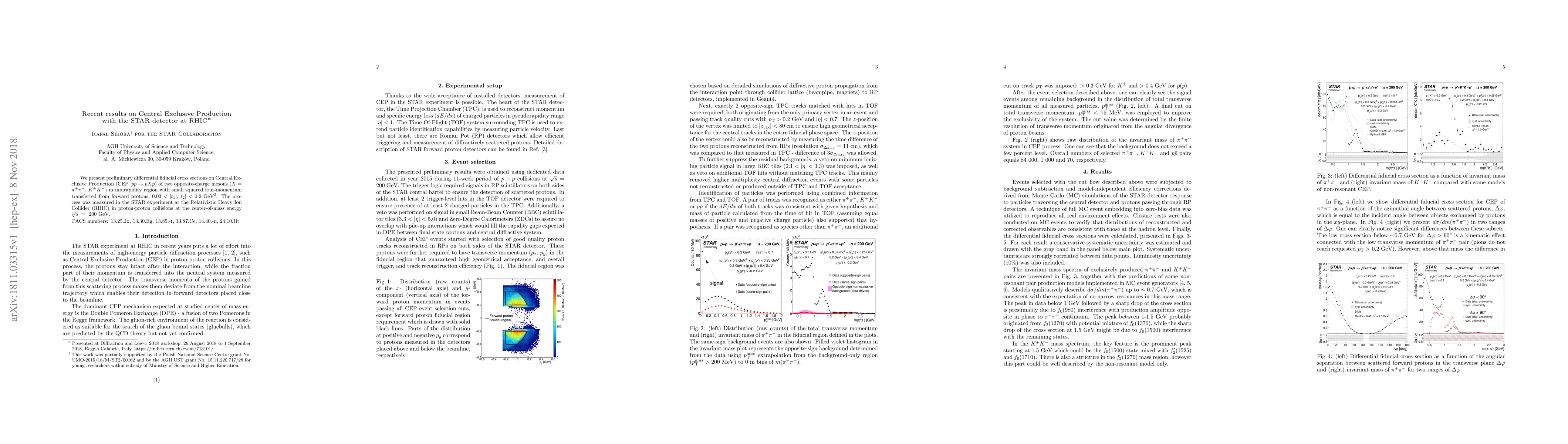 This paper reports preliminary results from the STAR detector at RHIC on differential fiducial cross sections for Central Exclusive Production of two opposite-charge mesons in proton-proton collisions at $\sqrt{s} = 200~\textrm{GeV}$. The study focuses on the midrapidity region with small squared four-momentum transfer.