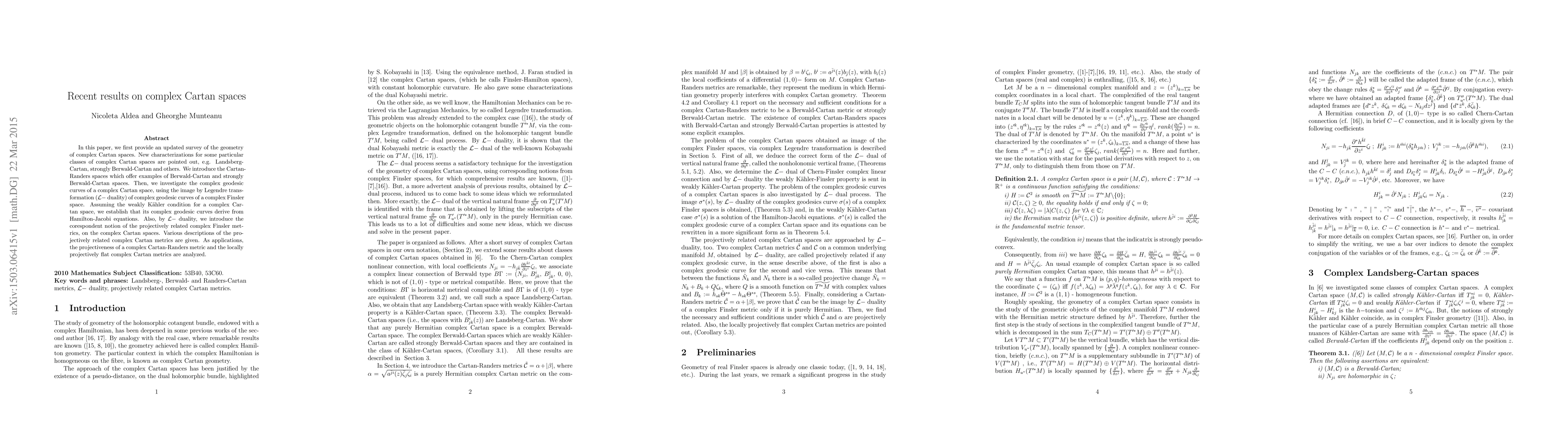 This paper presents new characterizations of complex Cartan spaces, introduces Cartan-Randers spaces, and investigates complex geodesic curves using Legendre transformation. It establishes Hamilton-Jacobi equations for weakly Kähler complex Cartan spaces and explores projective relations in complex Cartan metrics, with applications to Cartan-Randers and locally projectively flat metrics.