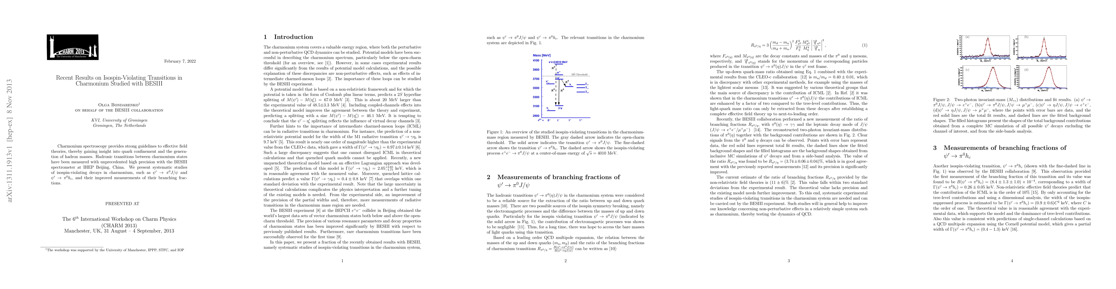 Charmonium spectroscopy provides strong guidelines to effective field theories, thereby gaining insight into quark confinement and the generation of hadron masses. Hadronic transitions between charmonium states have been measured with unprecedented high precision with the BESIII spectrometer at IHEP Beijing, China. We present systematic studies of isospin-violating decays in charmonium, such as $\psi' \rightarrow \pi^{0} J/\psi$, $\psi' \rightarrow \pi^{0} h_{c}$, $e^{+}e^{-} \rightarrow \pi^{0} J/\psi$ at $\sqrt{s}=$ 4.009 GeV, and their improved measurements of their branching fractions.