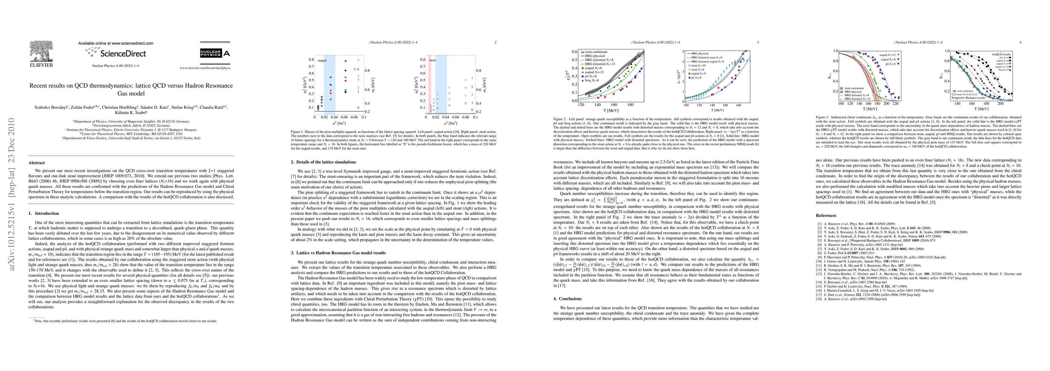 We present our most recent investigations on the QCD cross-over transition temperatures with 2+1 staggered flavours and one-link stout improvement [JHEP 1009:073, 2010]. We extend our previous two studies [Phys. Lett. B643 (2006) 46, JHEP 0906:088 (2009)] by choosing even finer lattices ($N_t$=16) and we work again with physical quark masses. All these results are confronted with the predictions of the Hadron Resonance Gas model and Chiral Perturbation Theory for temperatures below the transition region. Our results can be reproduced by using the physical spectrum in these analytic calculations. A comparison with the results of the hotQCD collaboration is also discussed.