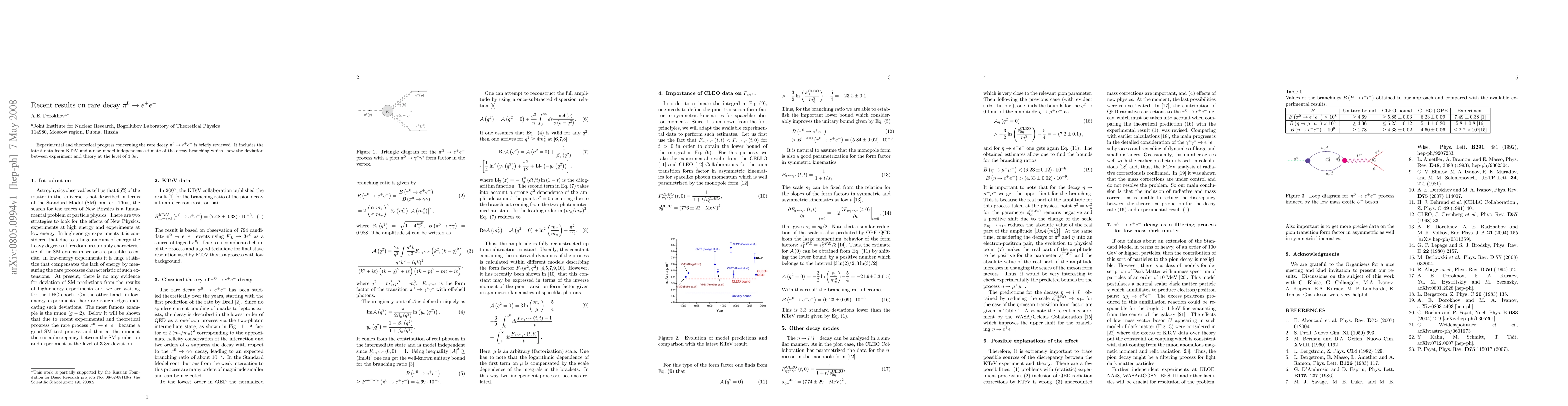 This paper reviews recent experimental and theoretical advancements on the rare decay of pi0 to e+e-, highlighting new data from KTeV and a model-independent branching ratio estimate, revealing a 3.3σ deviation between experimental and theoretical results.