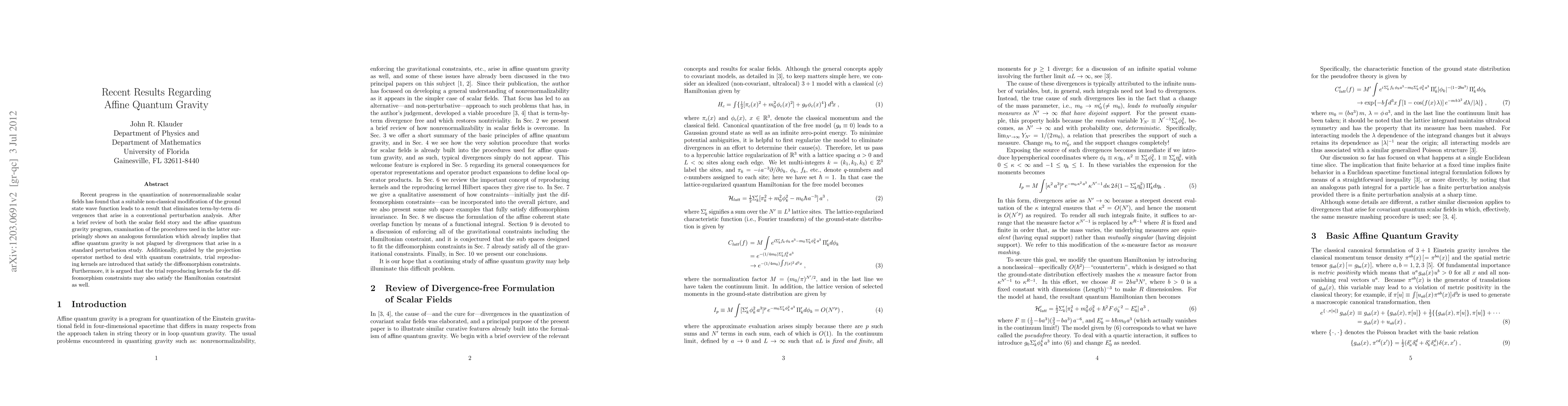 Recent progress in the quantization of nonrenormalizable scalar fields has found that a suitable non-classical modification of the ground state wave function leads to a result that eliminates term-by-term divergences that arise in a conventional perturbation analysis. After a brief review of both the scalar field story and the affine quantum gravity program, examination of the procedures used in the latter surprisingly shows an analogous formulation which already implies that affine quantum gravity is not plagued by divergences that arise in a standard perturbation study. Additionally, guided by the projection operator method to deal with quantum constraints, trial reproducing kernels are introduced that satisfy the diffeomorphism constraints. Furthermore, it is argued that the trial reproducing kernels for the diffeomorphism constraints may also satisfy the Hamiltonian constraint as well.