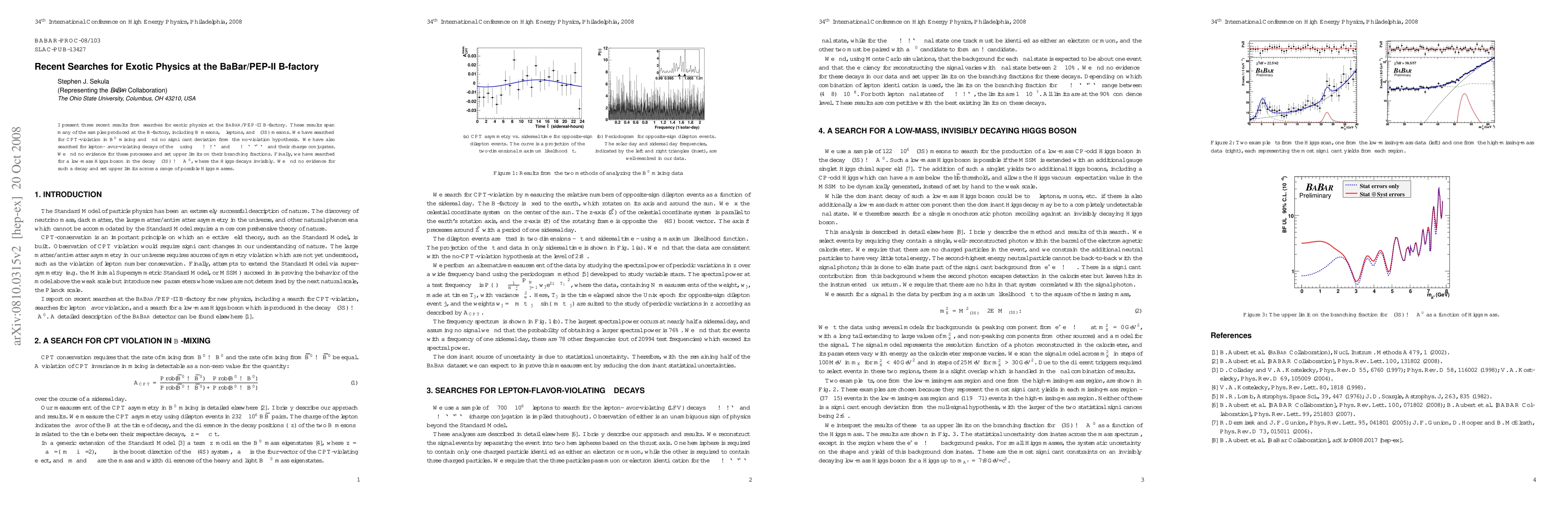 This paper reports three searches for exotic physics at the BaBar/PEP-II B-factory, finding no significant deviations from standard models in CPT-violation in B mixing, lepton-flavor-violating decays of tau leptons, and low-mass Higgs boson decays in Upsilon(3S) mesons. Upper limits are set for the branching fractions of these processes.
