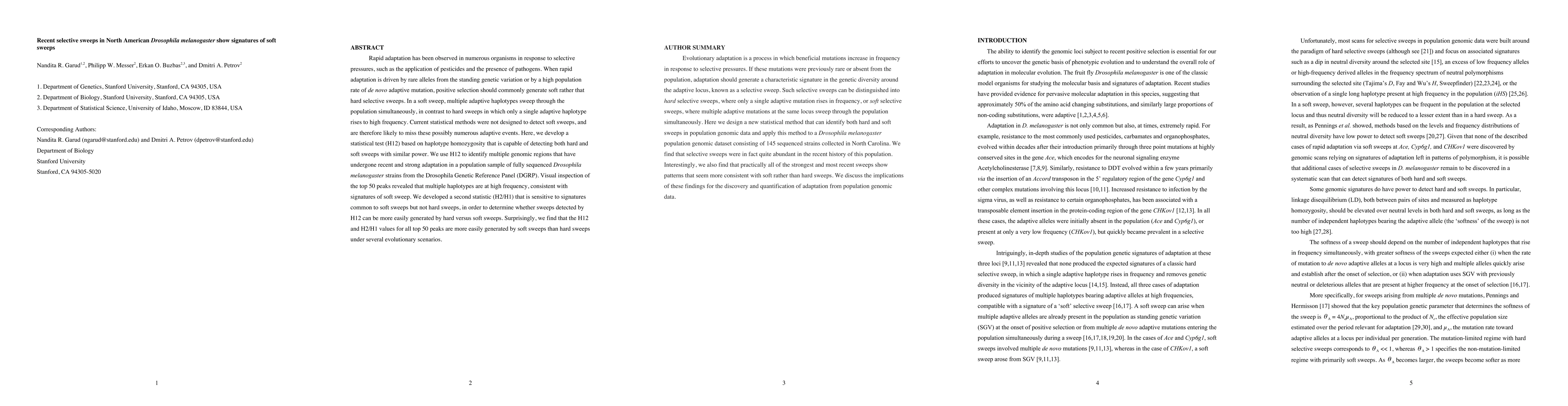 This paper develops a new statistical test (H12) to detect both hard and soft selective sweeps in Drosophila melanogaster, identifying multiple genomic regions with recent strong adaptive events. The results suggest that the detected sweeps are more likely to be soft sweeps, where multiple adaptive haplotypes rise simultaneously, rather than hard sweeps.