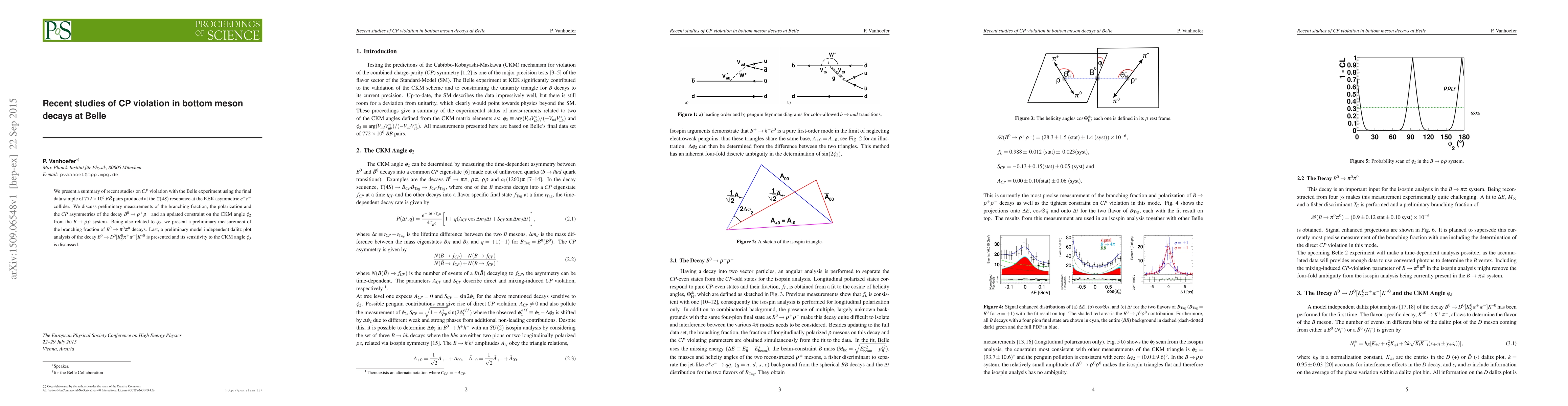 We present a summary of recent studies on $CP$ violation with the Belle experiment using the final data sample of $772 \times 10^{6}$ B\bar{B} pairs produced at the Ypsilon(4S) resonance at the KEK asymmetric e^+ e^- collider. We discuss preliminary measurements of the branching fraction, the polarization and the $CP$ asymmetries of the decay $B^0 \rightarrow \rho^{+} \rho^{-}$ and an updated constraint on the CKM angle $\phi_2$ from the $B\to\rho\rho$ system. Being also related to $\phi_2$, we present a preliminary measurement of the branching fraction of $B^0\rightarrow \pi^0\pi^0$ decays. Last, a preliminary model independent dalitz plot analysis of the decay $B^0 \rightarrow D^0[K_S^0\pi^+\pi^-]K^{*0}$ is presented and its sensitivity to the CKM angle $\phi_3$ is discussed.