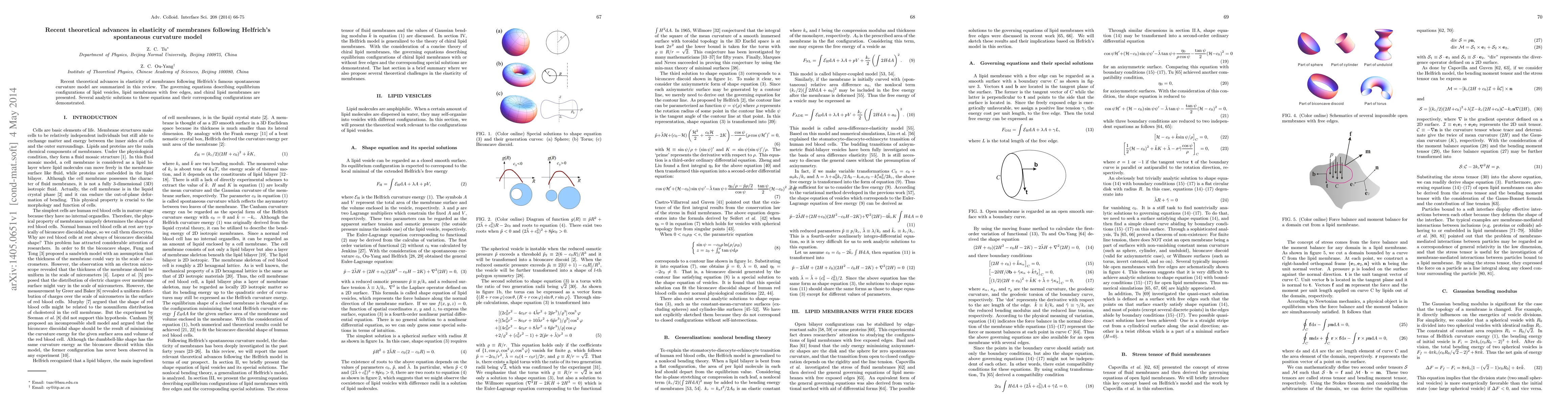 This review summarizes recent theoretical advances in membrane elasticity based on Helfrich's spontaneous curvature model, presenting governing equations for equilibrium configurations of lipid vesicles, membranes with free edges, and chiral lipid membranes, along with several analytic solutions.