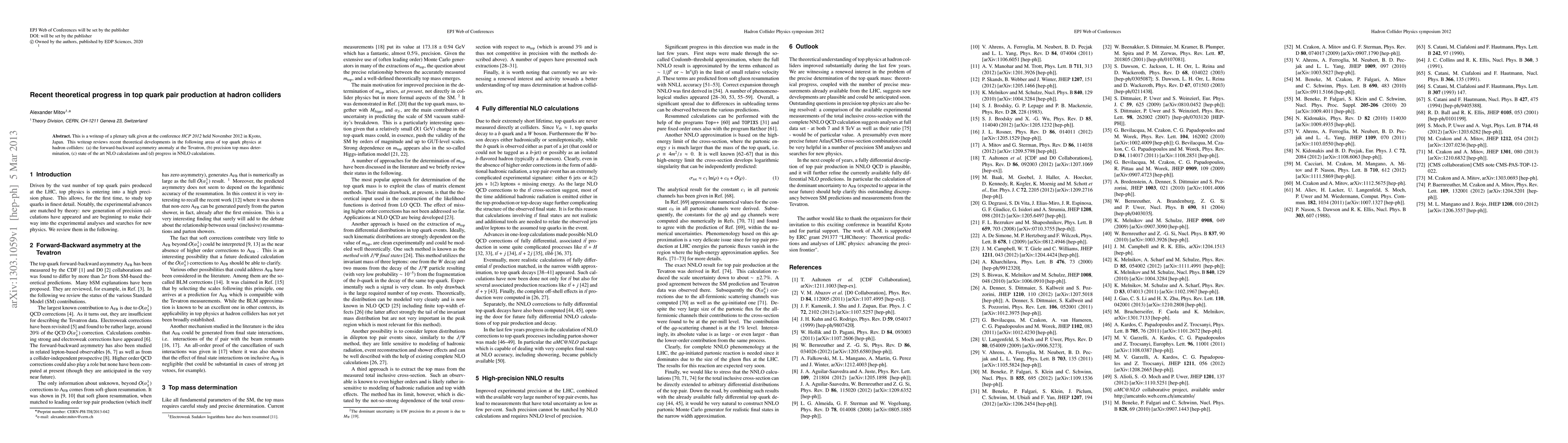 This paper reviews recent theoretical advancements in top quark pair production at hadron colliders, focusing on the forward-backward asymmetry anomaly at the Tevatron, precision top mass determination, state-of-the-art next-to-leading order calculations, and progress in next-to-next-to-leading order calculations. Presented at the HCP 2012 conference in Kyoto, Japan.