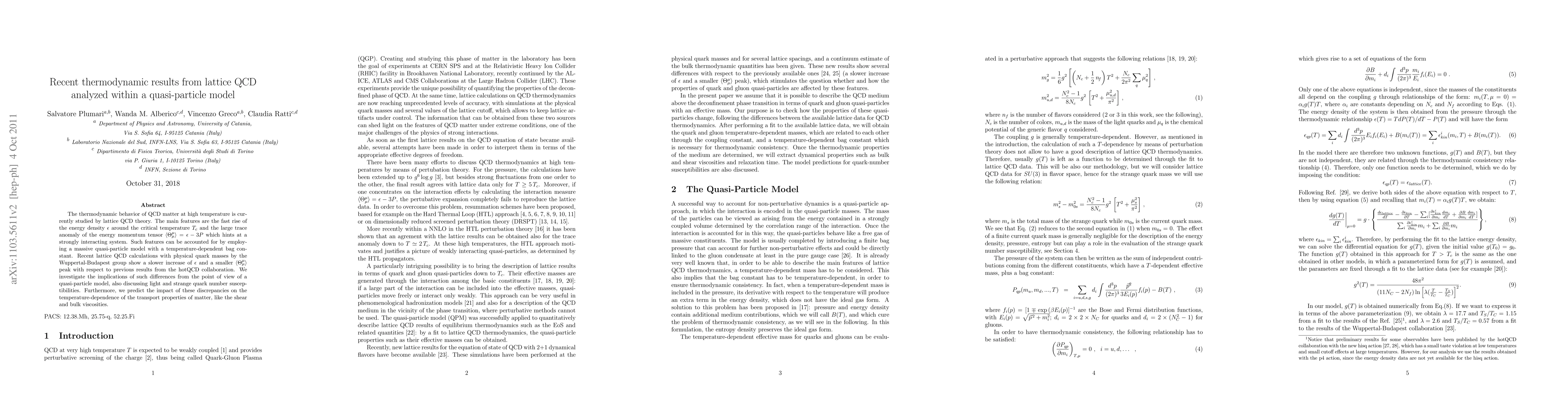 The thermodynamic behavior of QCD matter at high temperature is currently studied by lattice QCD theory. The main features are the fast rise of the energy density $\epsilon$ around the critical temperature $T_c$ and the large trace anomaly of the energy momentum tensor $< \Theta_\mu^\mu >=\epsilon - 3 P$ which hints at a strongly interacting system. Such features can be accounted for by employing a massive quasi-particle model with a temperature-dependent bag constant. Recent lattice QCD calculations with physical quark masses by the Wuppertal-Budapest group have shown a slower increase of $\epsilon$ and a smaller $<\Theta_\mu^\mu>$ peak with respect to previous results from the hotQCD collaboration. We investigate the implications of such differences from the point of view of a quasi-particle model, also discussing light and strange quark number susceptibilities. Furthermore, we predict the impact of these discrepancies on the temperature-dependence of the transport properties of matter, like the shear and bulk viscosities.