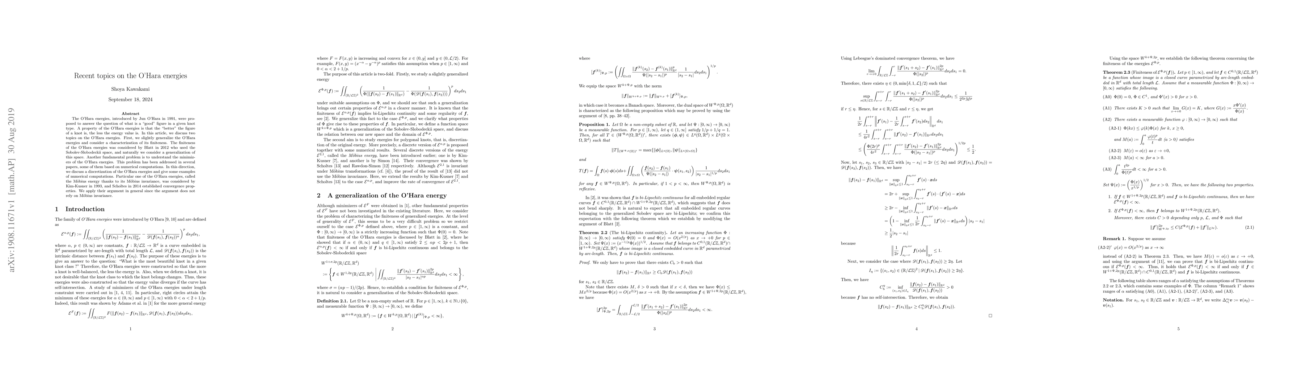 The O'Hara energies, introduced by Jun O'Hara in 1991, were proposed to answer the question of what is a "good" figure in a given knot type. A property of the O'Hara energies is that the "better" the figure of a knot is, the less the energy value is. In this article, we discuss two topics on the O'Hara energies. First, we slightly generalize the O'Hara energies and consider a characterization of its finiteness. The finiteness of the O'Hara energies was considered by Blatt in 2012 who used the Sobolev-Slobodeckii space, and naturally we consider a generalization of this space. Another fundamental problem is to understand the minimizers of the O'Hara energies. This problem has been addressed in several papers, some of them based on numerical computations. In this direction, we discuss a discretization of the O'Hara energies and give some examples of numerical computations. Particular one of the O'Hara energies, called the M\"{o}bius energy thanks to its M\"{o}bius invariance, was considered by Kim-Kusner in 1993, and Scholtes in 2014 established convergence properties. We apply their argument in general since the argument does not rely on M\"{o}bius invariance.