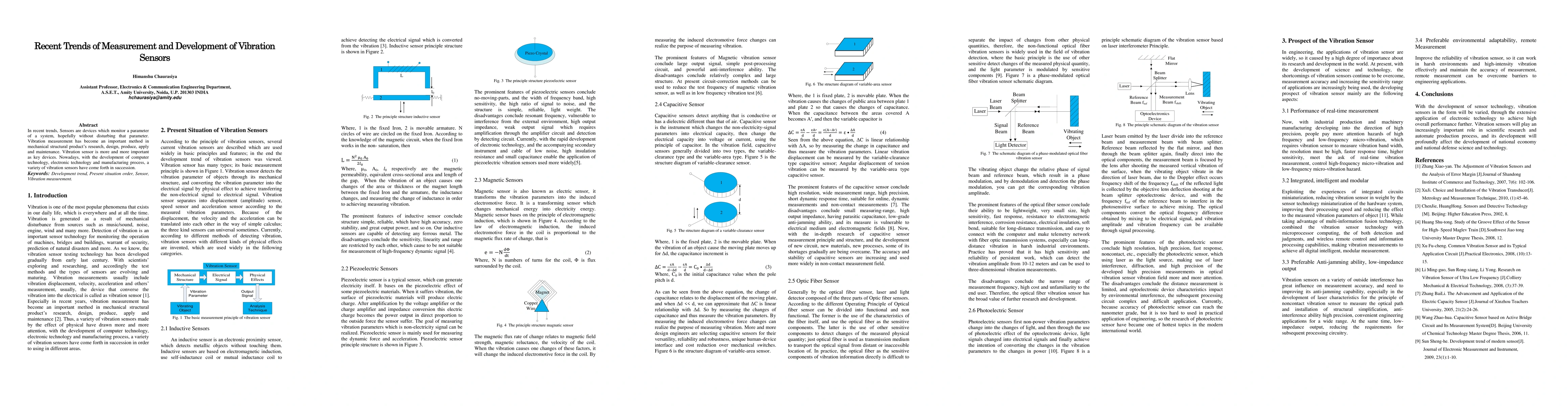 In recent trends, sensors are devices which monitor a parameter of a system, hopefully without disturbing that parameter. Vibration measurement has become an important method in mechanical structural products research, design, produce, apply and maintenance. Vibration sensor is more and more important as key devices. Nowadays, with the development of computer technology, electronic technology and manufacturing process, a variety of vibration sensors have come forth in succession.