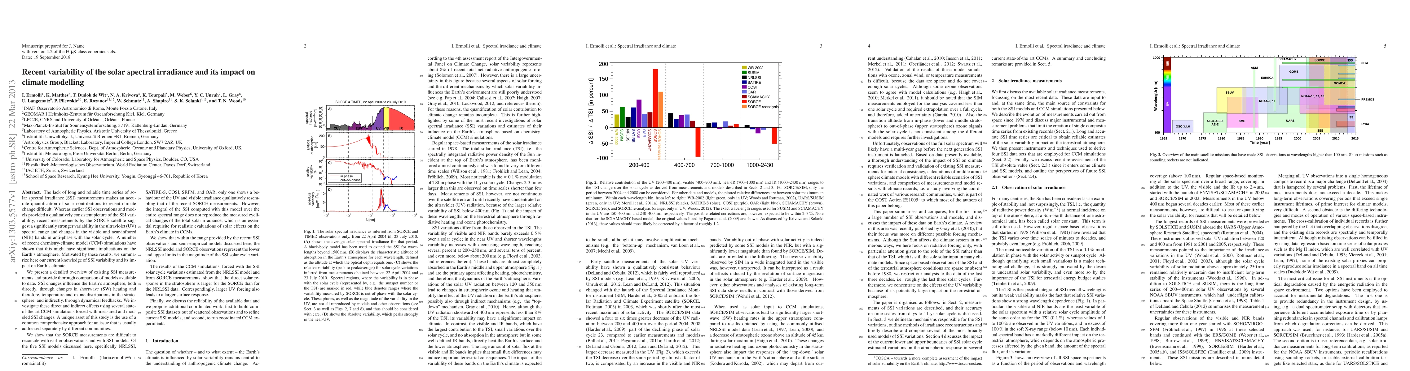 This paper reviews recent variability in solar spectral irradiance (SSI) and its implications for climate modeling, highlighting stronger ultraviolet variability and anti-phase changes in visible and near-infrared bands. The study uses state-of-the-art chemistry-climate models to assess direct and indirect atmospheric effects, proposing coordinated efforts to refine SSI datasets and models.