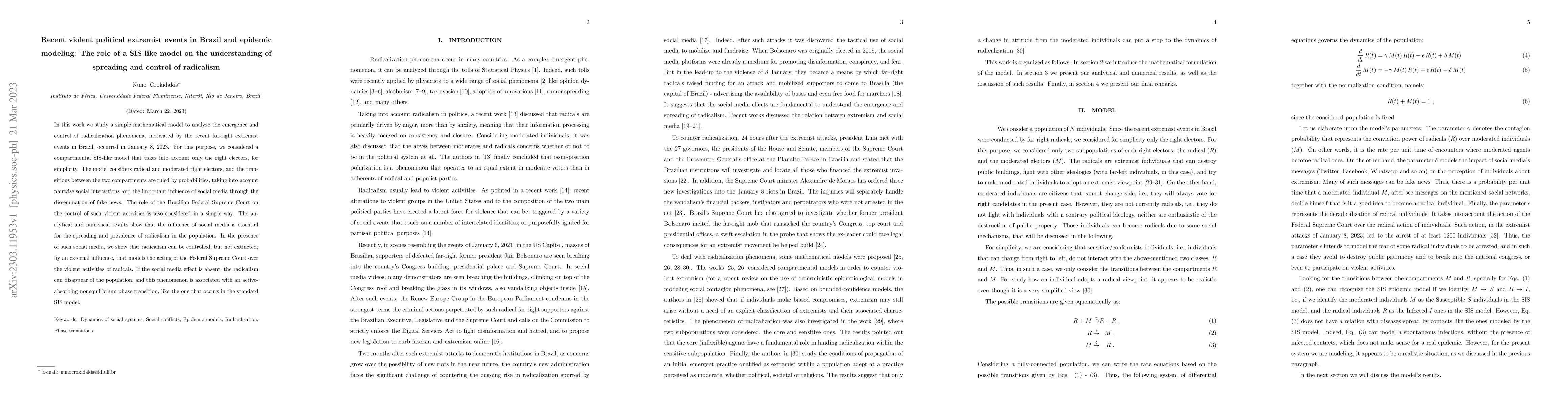 This paper proposes a SIS-like mathematical model to study the emergence and control of radicalization among right-wing electors in Brazil, emphasizing the role of social media and the Federal Supreme Court. The model reveals that social media significantly drives radicalism's spread, but it can be controlled, though not eradicated, through judicial intervention.