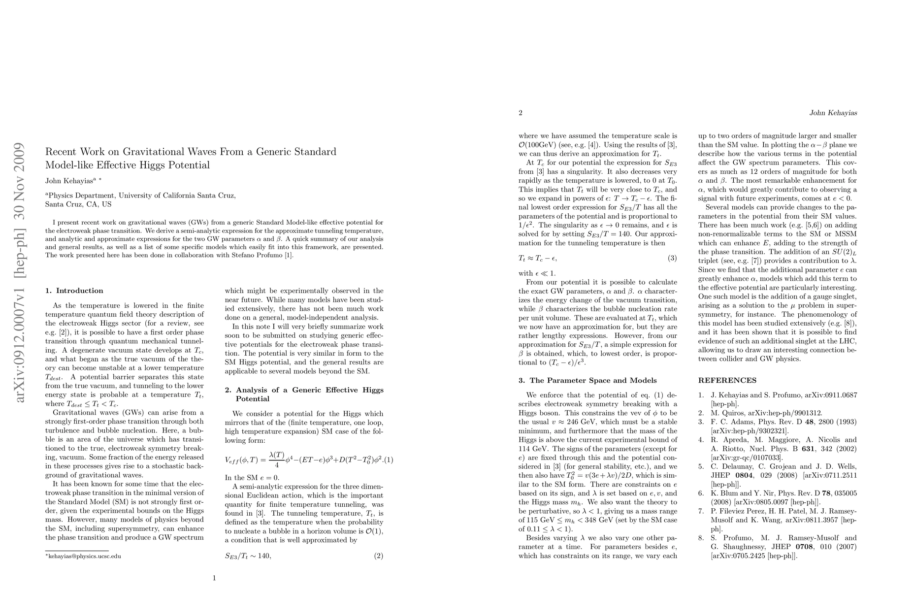 Researchers derived expressions for gravitational waves from a generic Standard Model-like effective potential, including tunneling temperature and two GW parameters, in collaboration with Stefano Profumo.