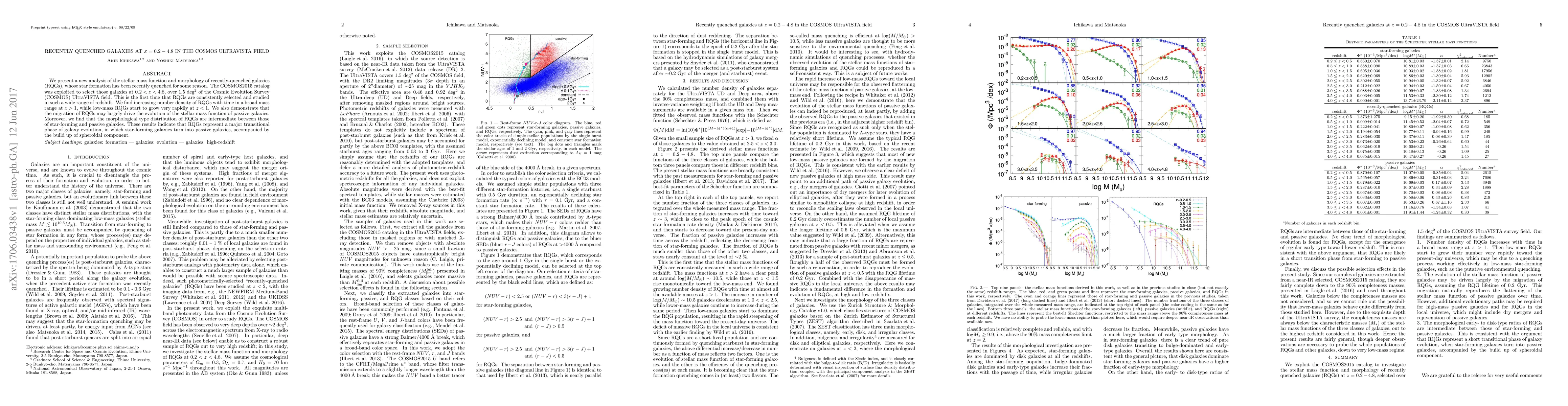 This study analyzes the stellar mass function and morphology of recently-quenched galaxies (RQGs) in the COSMOS UltraVISTA field, finding an increasing number density of RQGs over time, especially at higher redshifts. The results suggest RQGs play a significant role in the evolution of passive galaxies, with a morphology intermediate between star-forming and passive galaxies.